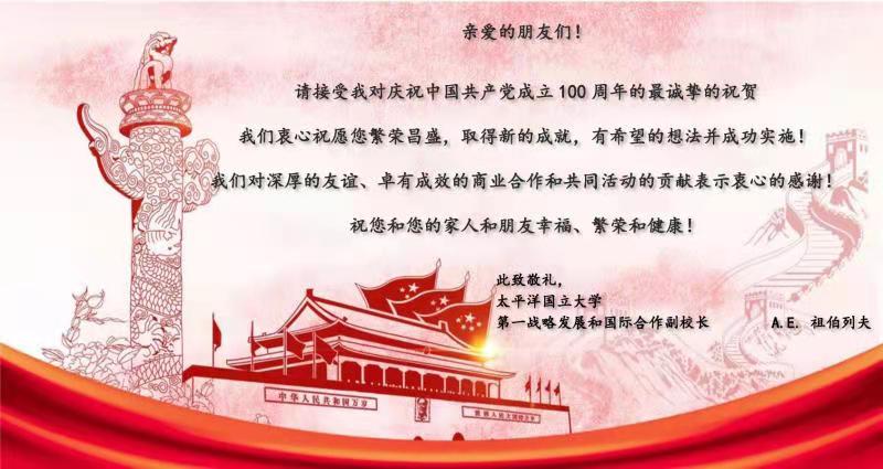 太平洋国立大学副校长A.E.祖伯列夫以天安门为背景图发来贺信,表达了他对中国共产党成立100周年的诚挚祝贺,并对两校长期以来的友好合作表示感谢,未来将继续推进双方合作共赢之格局。