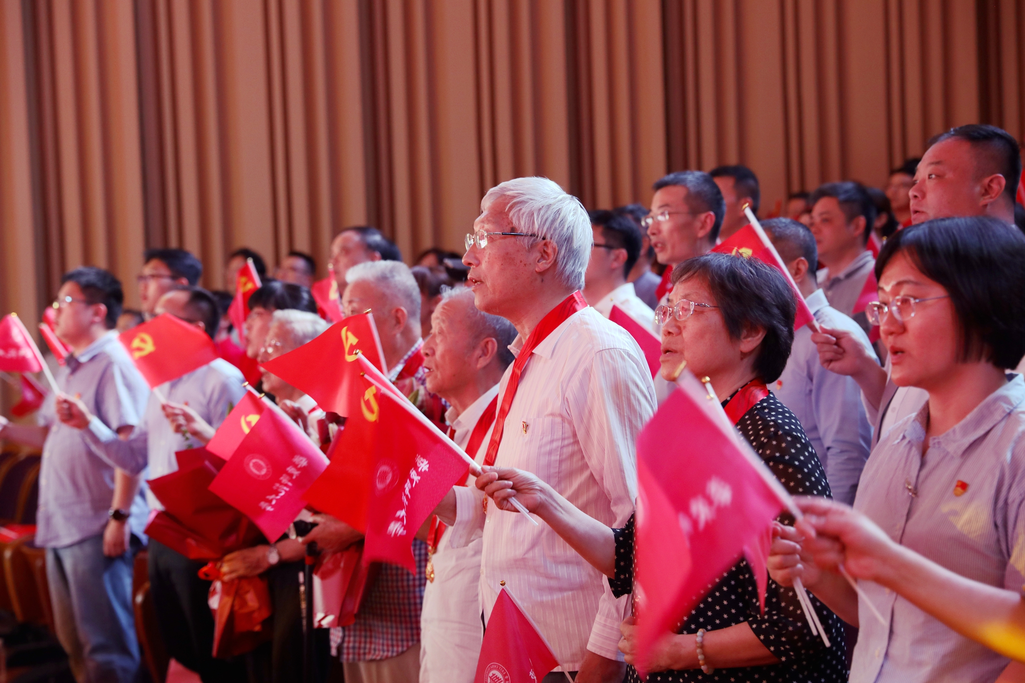 今年,党中央决定首次颁发“光荣在党50年”纪念章。大会邀请了5位党龄达到50周年的老同志代表——离休干部第一党支部书记赵继铨同志,离休干部第三党支部书记包汉中同志,退休干部、原校党委副书记吴铎同志,物理与电子科学学院退休教师马龙生同志,退休干部、校关工委委员、特邀党建组织员孙桂华同志。校党委书记梅兵,校长、校党委副书记钱旭红为他们颁发了“光荣在党50年”纪念章,学生党员为老同志献上了鲜花,全场响起了雷鸣般的掌声,经久不息。