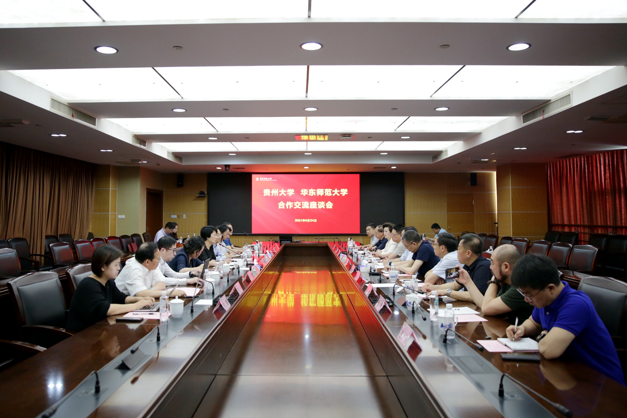 6月24日,校党委书记梅兵会见了来访的贵州大学党委书记李建军一行,双方就进一步深化合作相关事宜进行了交流座谈。贵州大学副校长杨松,党委常委、组织部部长李昕昌,华东师大党委常委、党委组织部部长程静,校长助理斯阳及相关院系、职能部门负责人等参加座谈会。