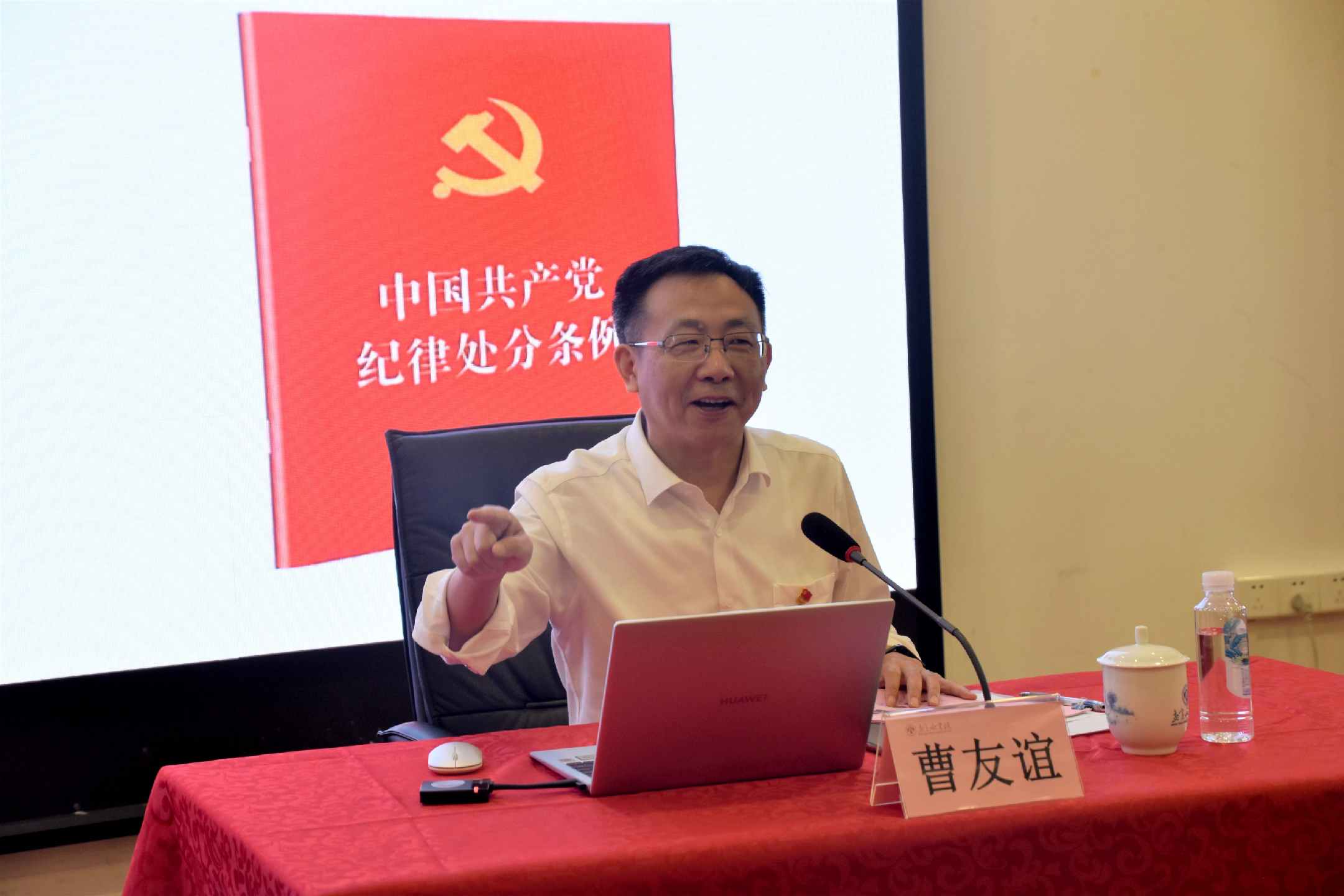 6月16日上午,校党委副书记、纪委书记曹友谊为孟宪承书院2021届毕业生党员讲授题为“‘法’‘德’并举,师为世范”的专题党课。党课融合党史学习教育、党规党纪教育和师德师风教育等内容。校纪委办、马克思主义学院、外语学院、化学与分子工程学院、生命科学学院负责同志以及孟宪承书院班子成员、全体教工党员参加。100余名毕业生党员和非毕业班党员参加党课。