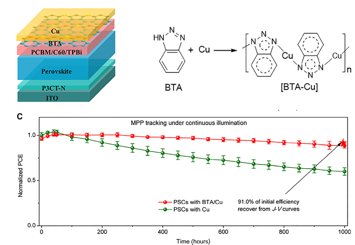 方俊锋团队在前期原位交联策略提升钙钛矿层稳定性的基础上(Nat.Commun.2018,9,3806),进一步围绕钙钛矿电池中电极腐蚀这一问题,提出电极化学防腐的概念,采用有机防腐蚀抑制剂苯并三氮唑(BTA,图1)来抑制钙钛矿电池中Cu电极的腐蚀;利用BTA与Cu之间的相互作用,在电极表面形成一层致密的聚合物薄膜,从而抑制Cu在富碘环境下的化学腐蚀以及电场下的电化学腐蚀,在不显著影响电池效率的前提下,实现钙钛矿电池稳定性的大幅提升。钙钛矿电池在经过1000小时的连续功率输出后(光照、负载),仍能稳定在初始效率的~90%(图1)。此外,器件的空气(水氧)稳定性和热(85°C)稳定性也有明显提升,分别经过2500小时或者1000小时的老化后,均能保持在初始效率的90%以上。