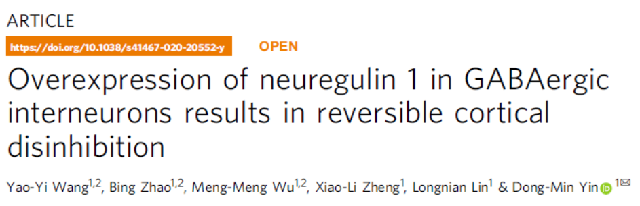 大脑皮层去抑制是诸多精神性疾病如精神分裂症、自闭症、智力障碍的共同特征,但其背后的生物学机制并不完全清楚。1月12日,华东师大生命科学学院脑功能基因组学教育部重点实验室殷东敏课题组在Nature Communications在线发表题为Overexpression of neuregulin 1 in GABAergic interneurons results in reversible cortical disinhibition的研究论文,揭示了精神分裂症大脑皮层去抑制的神经机制。华东师大为论文的完成单位,生命科学学院博士研究生王耀一、赵冰、吴梦孟为论文的共同第一作者,殷东敏研究员为论文的通讯作者。