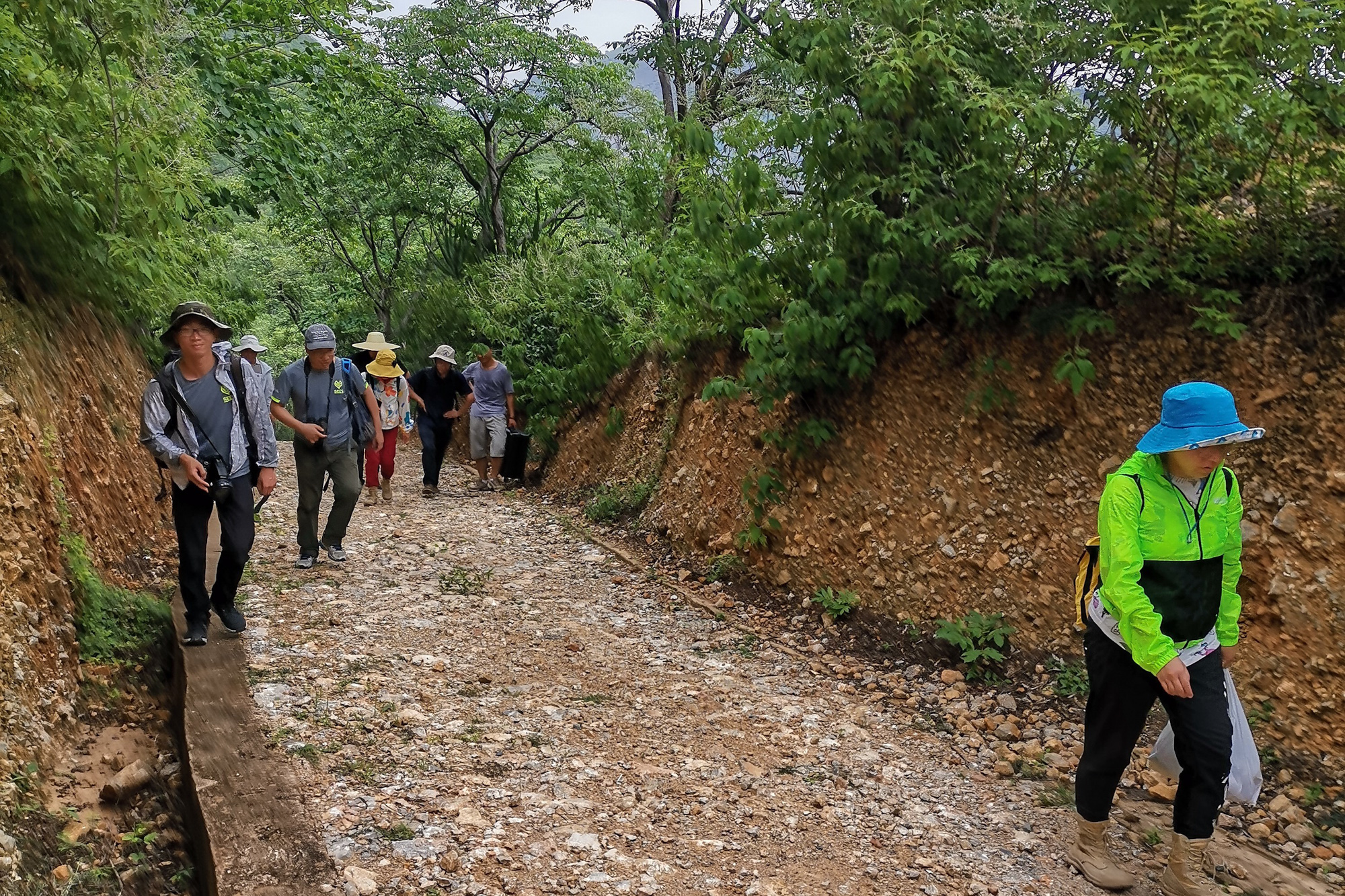 在乘车翻越崇山峻岭后,横隔在两山之间的河谷,成为了进入元江干热河谷生态站的最后一道屏障,唯一能通过的,是长达180米、一次仅能通过10人的铁索桥,而通过铁索桥后步行到达生态站的最后1000米,无疑是课程开课以来最为艰难的一段路程——用大小石子铺成的宽仅2米的陡峭山路,极易打滑,几乎无法容纳汽车通行。炎热的天气对每一位老师和学生的体力也形成了严峻的考验。脚下的每一步路成为了生态学家跋山涉水追求自然之美的诠释和缩影,引导学生以身体力行感受生态学研究之艰辛、感悟生态学家上下求索的科研精神。