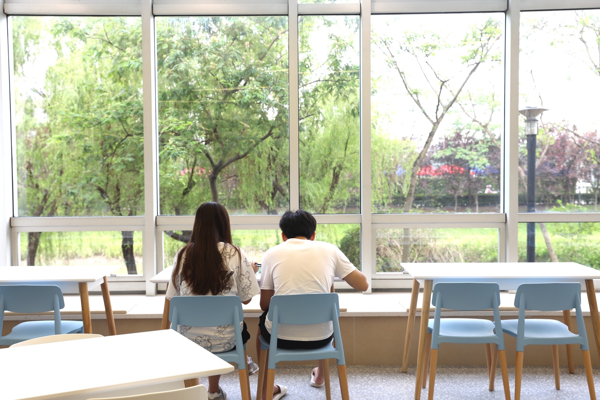在一楼、二楼远离售餐台、座位使用率不高的区域设置了休闲区,可以在就餐时间以外为师生提供交流、学习、研讨的空间。