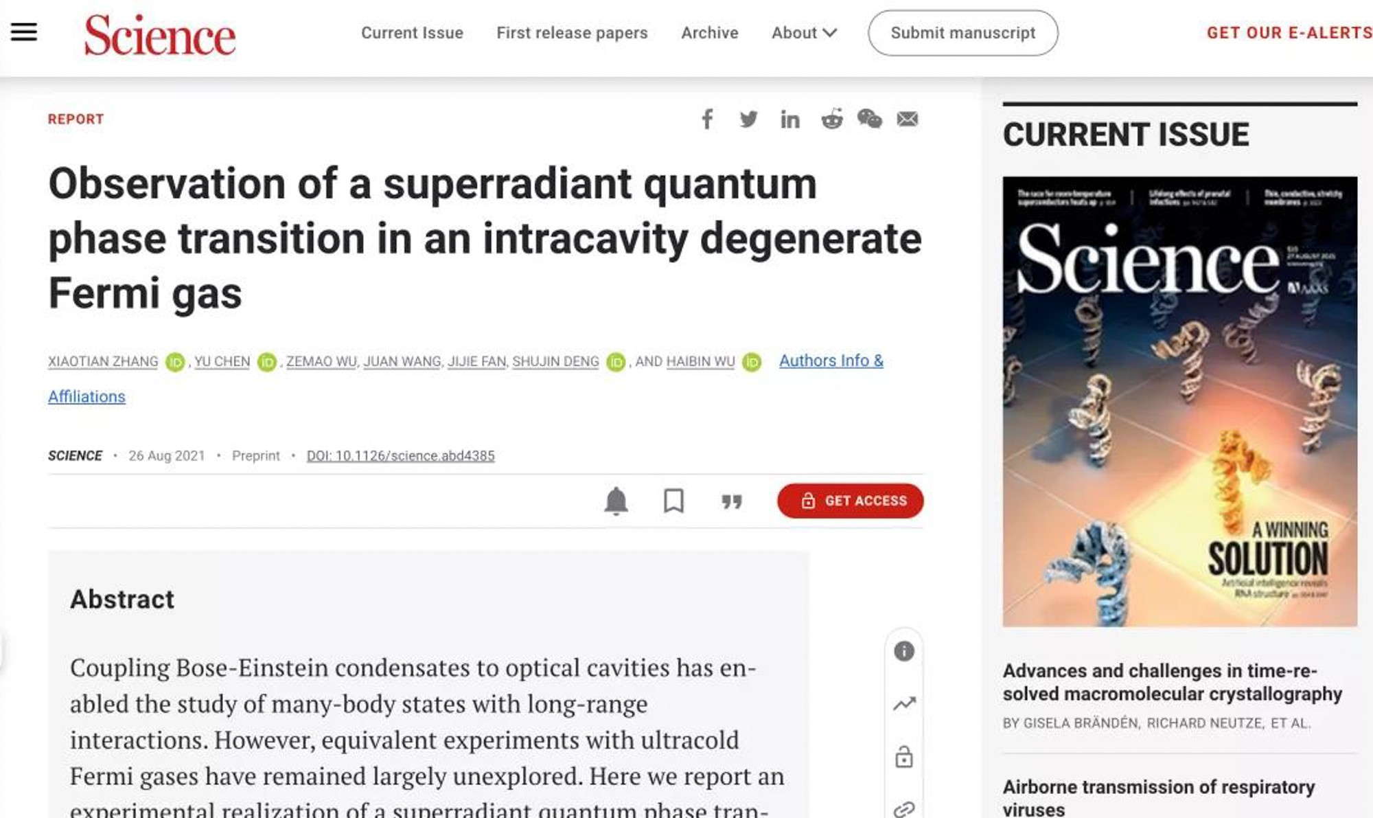 美国时间8月26日,国际物理学权威学术期刊《科学》(Science)杂志以“First Release”形式刊发beat365正版唯一官网精密光谱科学与技术国家重点实验室武海斌教授课题组的研究成果“光学腔内超冷简并费米气体超辐射量子相变的观测”。这是2016年发表《标度不变的费米气体中Efimovian膨胀的观察》后,武海斌团队成果以beat365正版唯一官网为第一完成单位再登《科学》正刊。