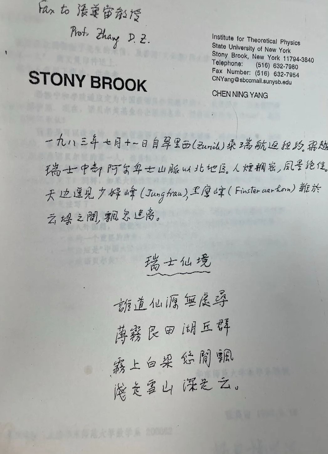 1996年10月8日,杨振宁为张奠宙发来他1983年在飞越瑞士中部阿尔卑斯山脉以北地区时写下的诗歌,亲笔抄录:谁道仙源无处寻,薄雾良田湖丘群。雾上白垛悠闲飘,浅是雪山深是云。这首诗即景说理,也收录在文集中。