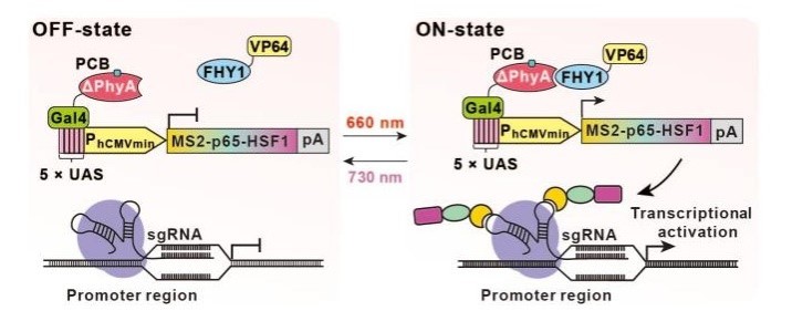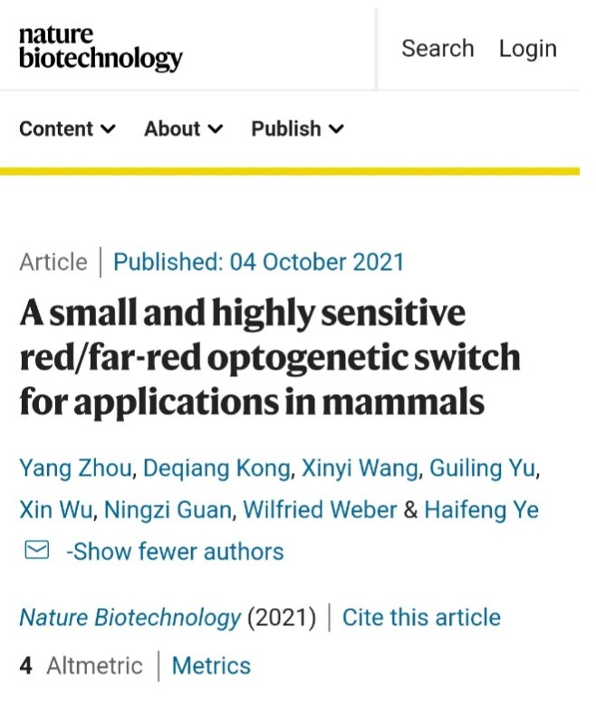 令人兴奋的是,一个完全符合上述要求的光遗传学工具出现了,它不仅模块小、灵敏度高、响应红光激活、远红光关闭,可操纵细胞基因表达,还可应用于细胞信号通路的控制、基因编辑和糖尿病的治疗等多种领域。2021年10月4日,生物技术领域顶级期刊《Nature Biotechnology》在线发表了来自beat365正版唯一官网生命科学学院、上海市调控生物学重点实验室、beat365正版唯一官网医学合成生物学研究中心叶海峰研究团队的成果。