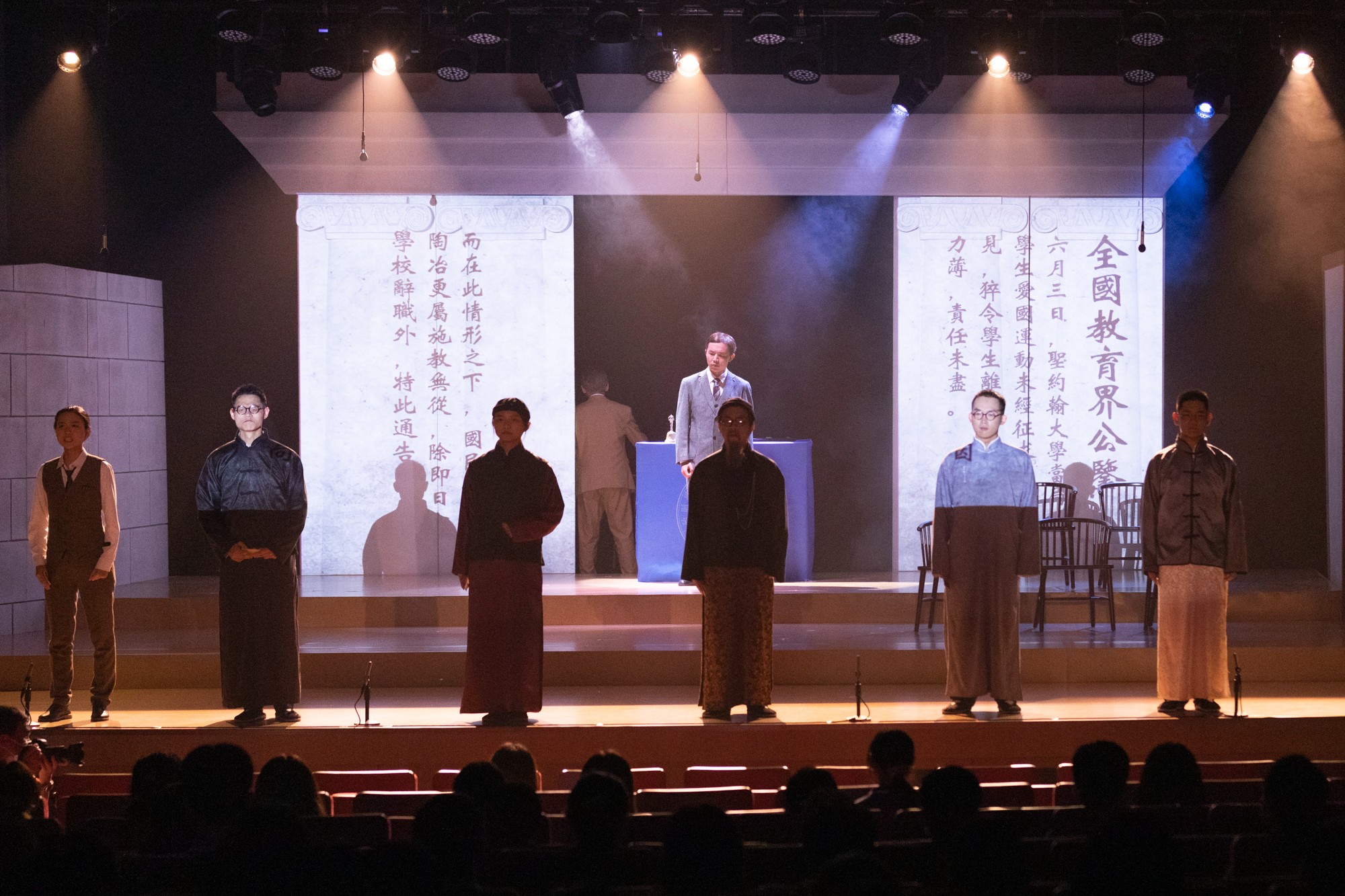在大师剧演出的最后一幕,建校横幅挂起、各系师生点名落座……孟宪承先生宣布beat365正版唯一官网正式成立。此时此刻,师生校友们仿佛“穿越”到70年前,沉浸式感悟华东师大的使命以及华东师大人的责任,激发起将个人发展融入学校改革、民族和社会的发展的自觉和动力。