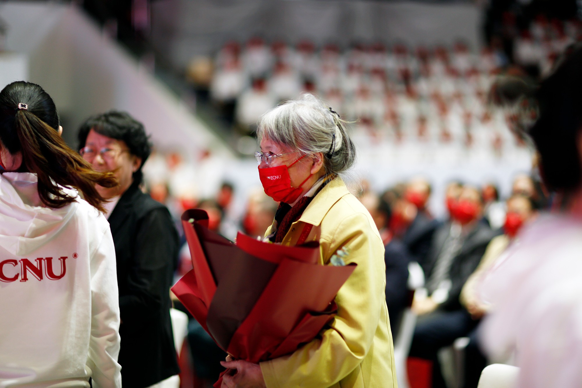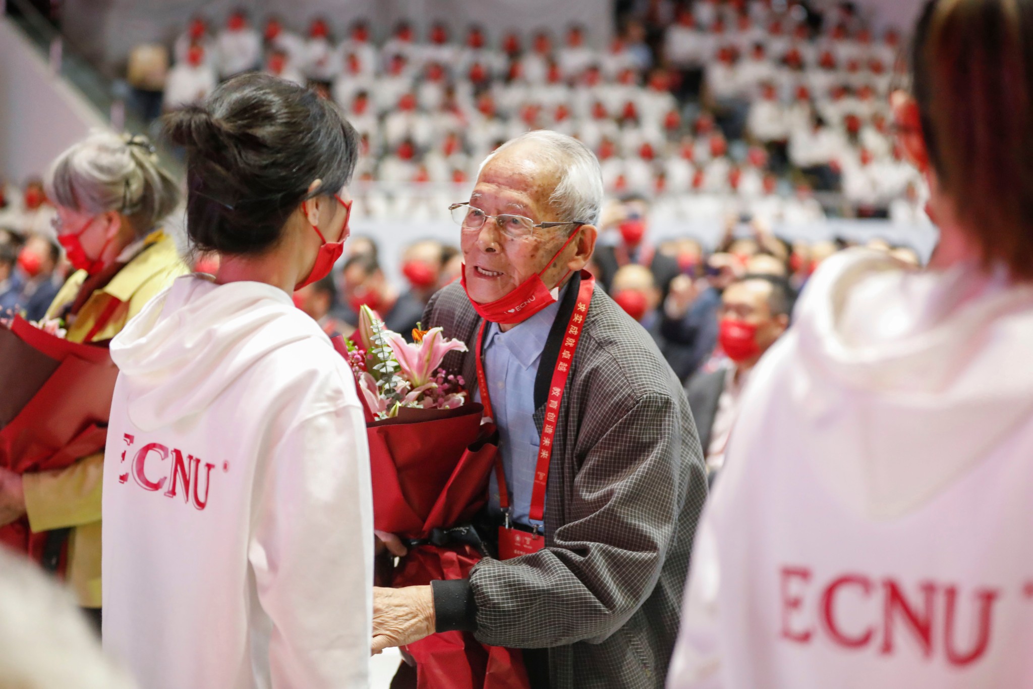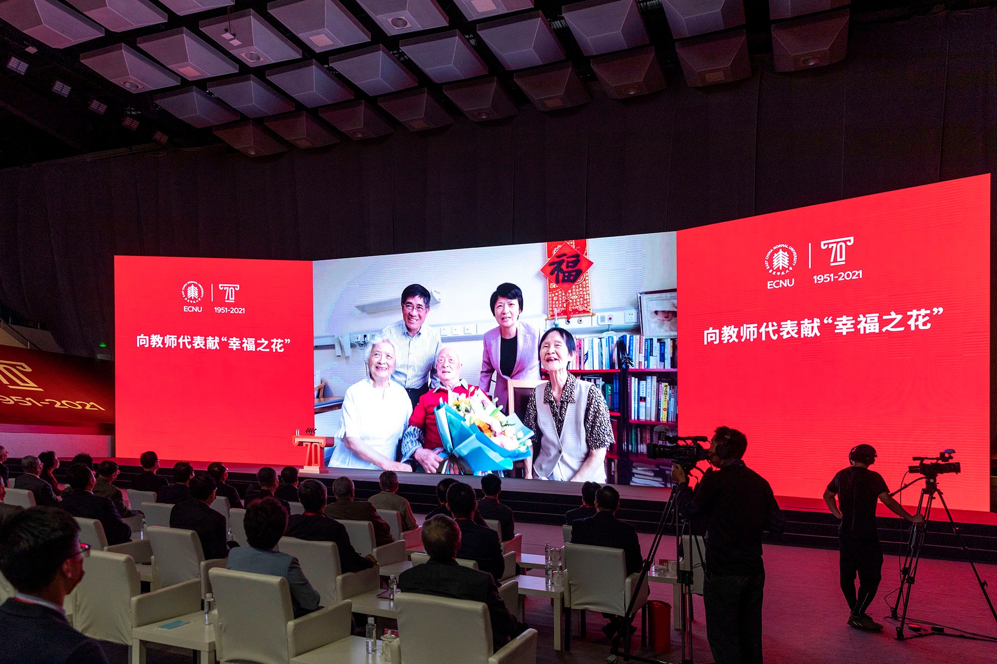 师大出大师,师大有大爱。校庆前夕,党委书记梅兵,原党委书记张济顺、童世骏专程看望了110岁的施平书记、90岁的严凤霞书记,代表全校师生和全体校友献花,把校庆的喜悦和后辈的祝福带给他们。大会上,学生代表向为师大发展付出智慧和汗水的教职工代表献上“幸福之花”。教职工代表中有德高望重的老教授,有砥柱中流的学术骨干,有亦师亦友的辅导员,也有默默奉献的员工,他们代表了70年来为师大发展辛勤工作、倾力奉献的近万名在岗和离退休的教职员工,他们共同浇灌了师大的幸福之花。