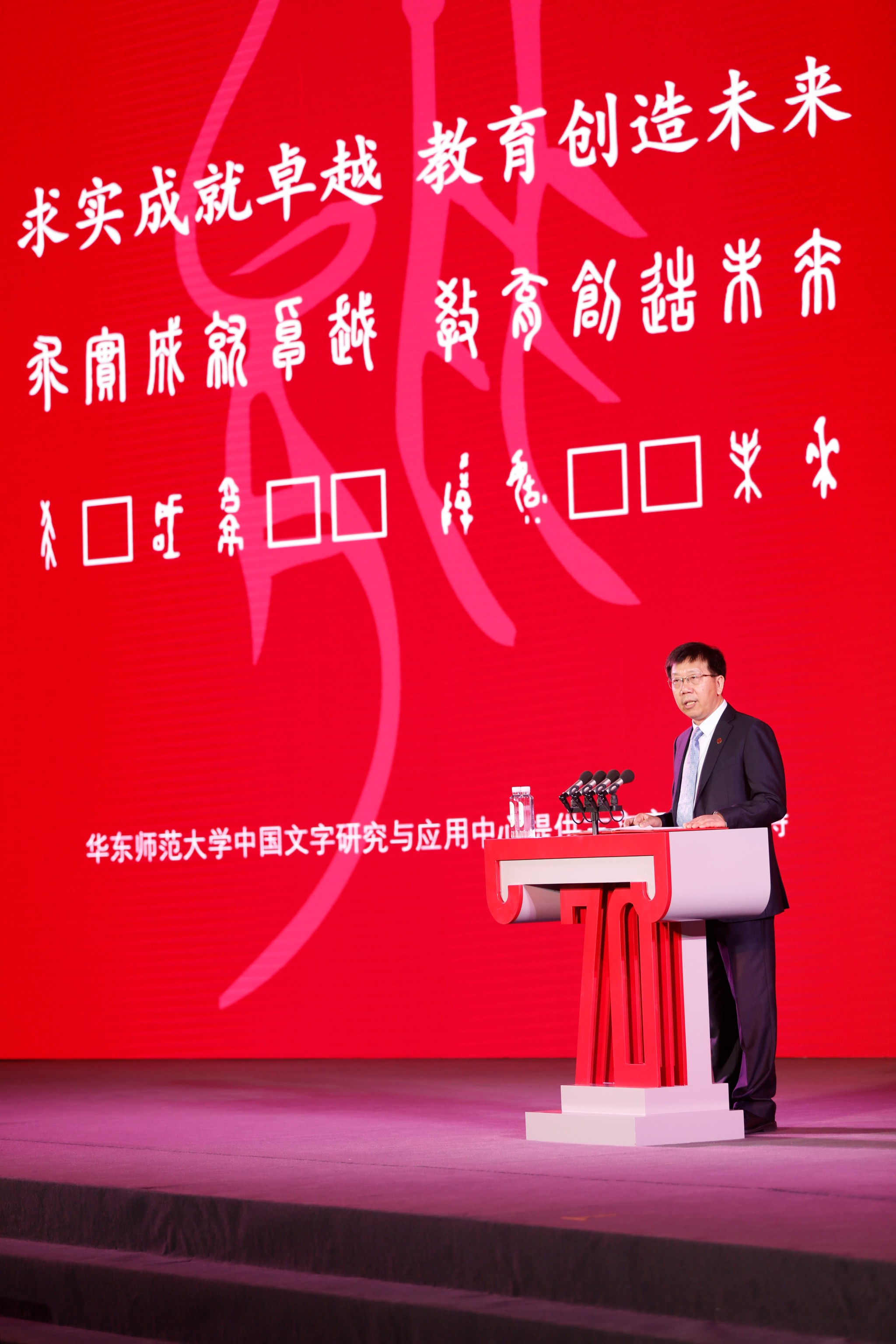 钱旭红致辞时身后大屏幕同步显示甲骨文和小篆版内容