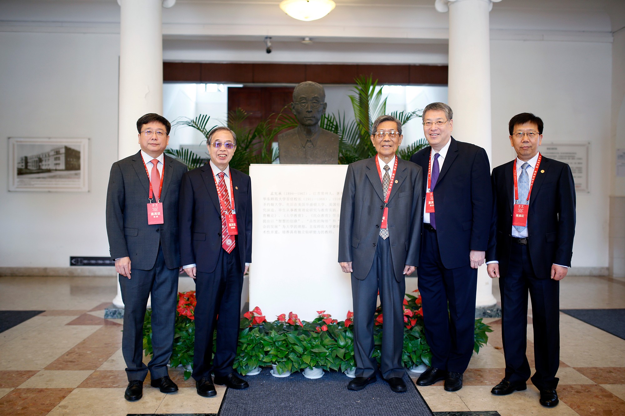 校长“同框”:华东师大校长钱旭红,原校长张瑞琨、王建磐、俞立中、陈群在群贤堂与孟宪承校长塑像合影
