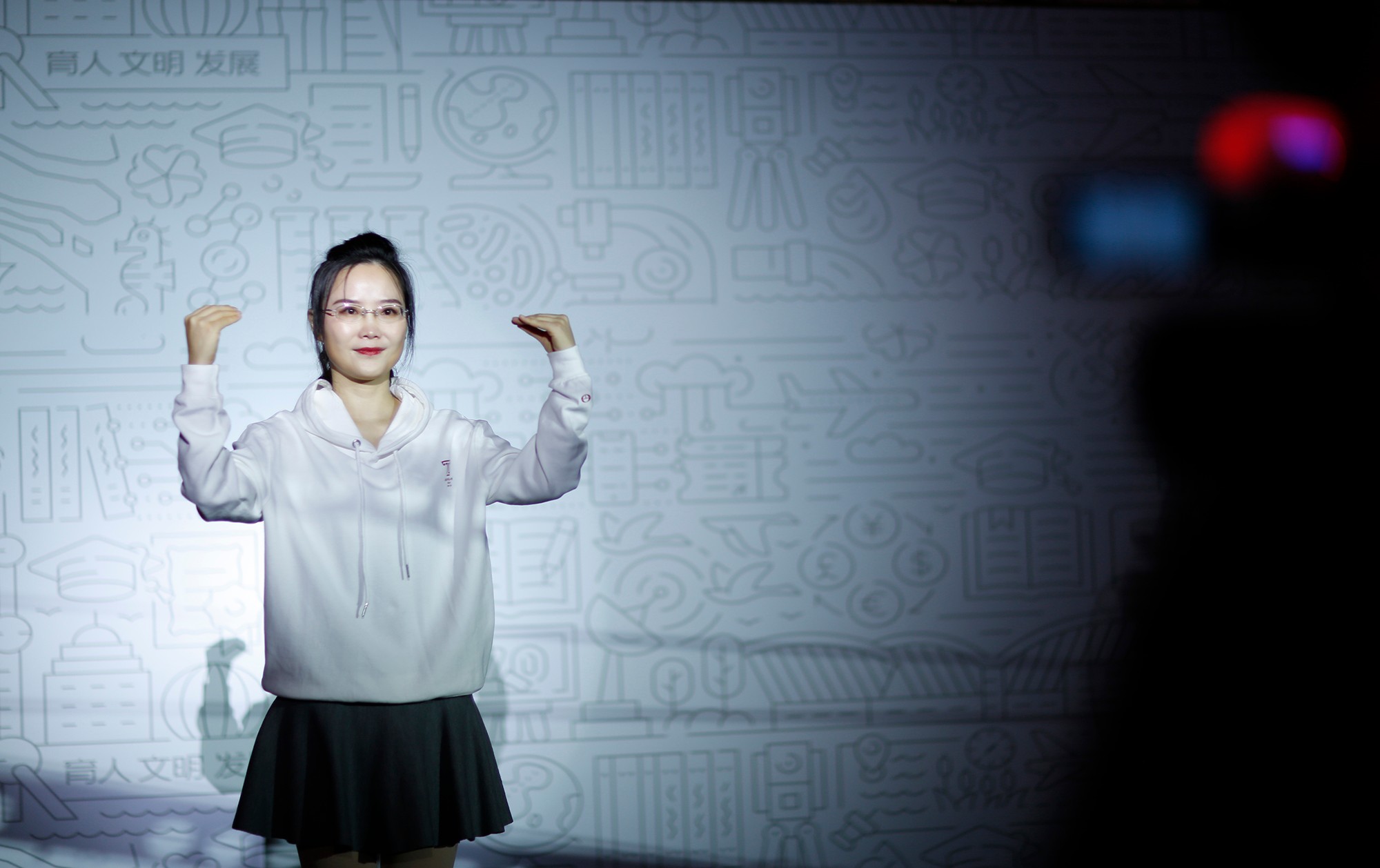 三位华东师大特殊教育专业毕业生使用国家通用手语和上海地方手语为大会进行同声传译