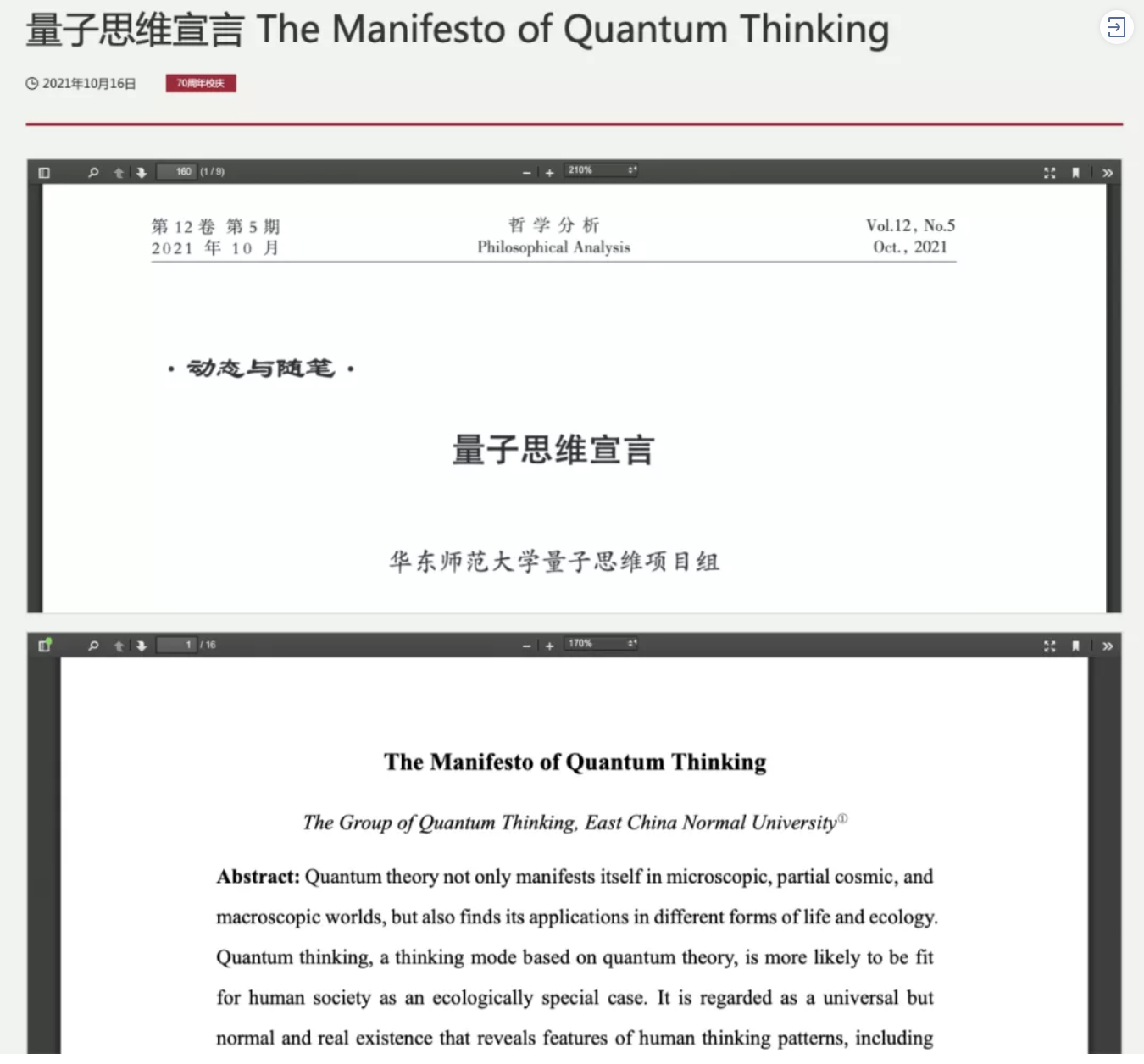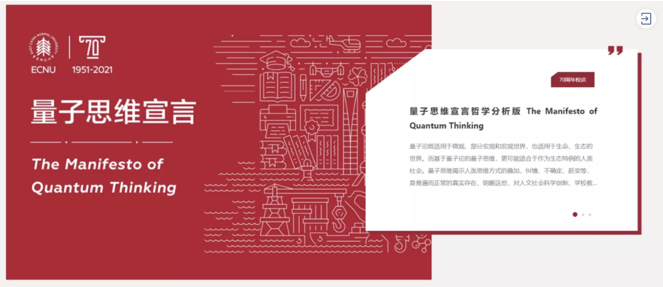 在beat365正版唯一官网建校70周年之际,学校举办“幸福之花学科交叉发展论坛”,以“学术之庆”开启卓越学术新起点。学校正式发布中英文双语版《量子思维宣言》,其内容基础来自华东师大“幸福之花”先导研究基金项目“跨越时空和学科及生命的量子学说与量子思维”的阶段性成果。