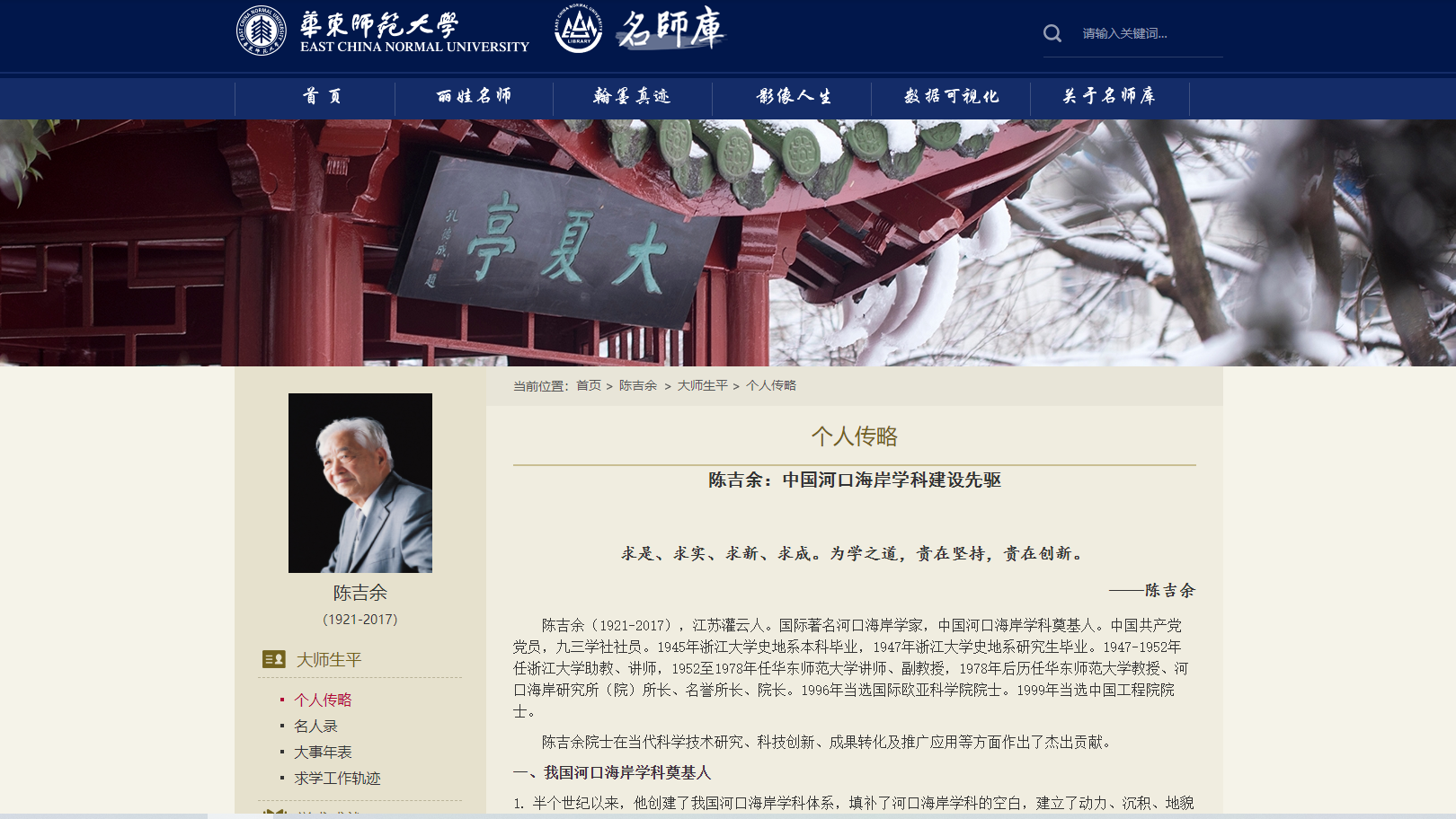 陈吉余先生建立了动力、沉积、地貌相结合的河口海岸学科体系,创建了我国第一个河口海岸研究机构,是我国河口海岸学科的奠基人,理论应用于工程实践的开拓者。他倡导并组织参与了全国海岸带和海涂资源综合调查;他提出长江河口发育模式及自适应和人工控制理论,为长江口深水航道选槽和河口治理提供了科学依据;他建议利用潮滩建设浦东国际机场并主持九段沙生态工程,取得了显著社会经济效益;他提出长江河口寻求干净水源的建议,促成了青草沙水库的建设;他根据涨潮冲刷槽理论提出陈山原油码头选址方案,开创了在杭州湾强潮海湾建港的先例。陈吉余先生在河口治理、海岸工程、沿海港口发展、洪涝灾害防治以及水资源利用、第三驱动力对河口影响、流域-河口相互作用等众多研究领域,取得了卓越成就。