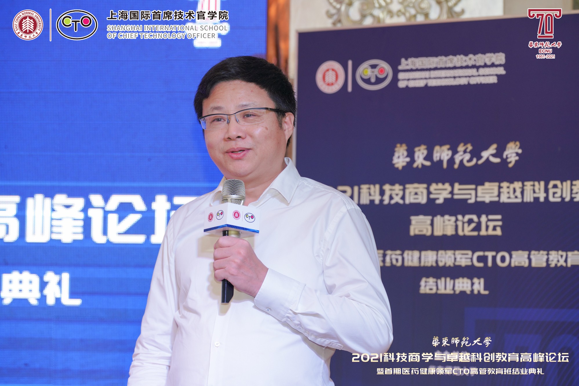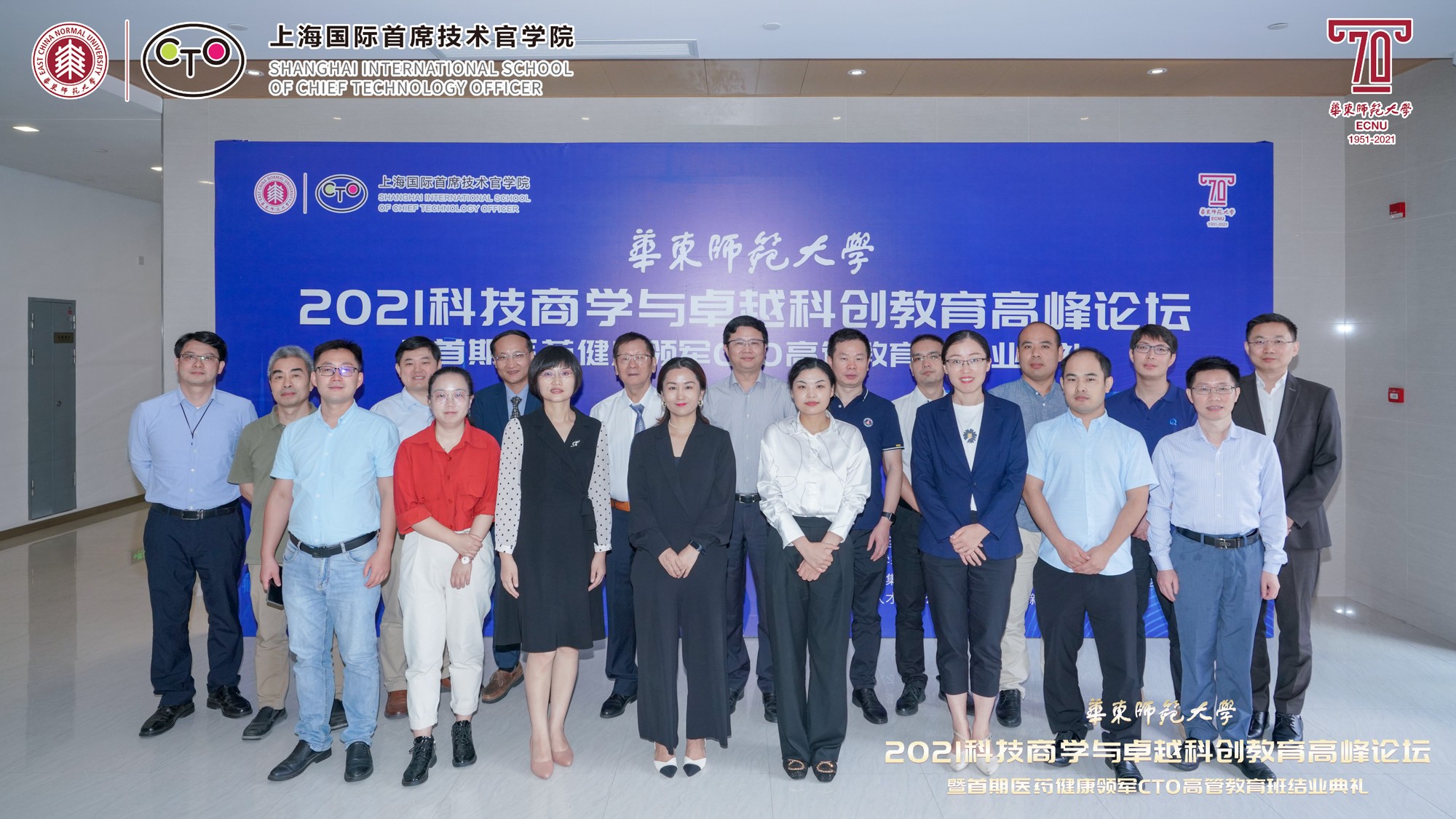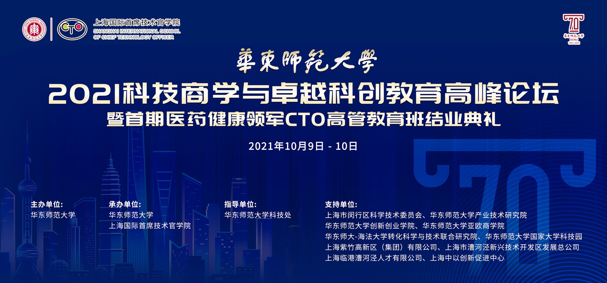 10月9日至10日,在beat365正版唯一官网即将迎来七十华诞之际,由华东师大主办、上海国际首席技术官学院(以下简称“CTO学院”)承办、华东师大科技处指导的“2021科技商学与卓越科创教育高峰论坛暨首期医药健康领军CTO高管教育班结业典礼”举行。本次论坛得到上海市闵行区科委、上海紫竹高新区(集团)有限公司、上海市漕河泾新兴技术开发区发展总公司、上海临港漕河泾人才有限公司、上海中以创新促进中心、华东师大产业技术研究院、创新创业学院、亚欧商学院、转化科学与技术联合研究院、华东师大国家大学科技园的大力支持。