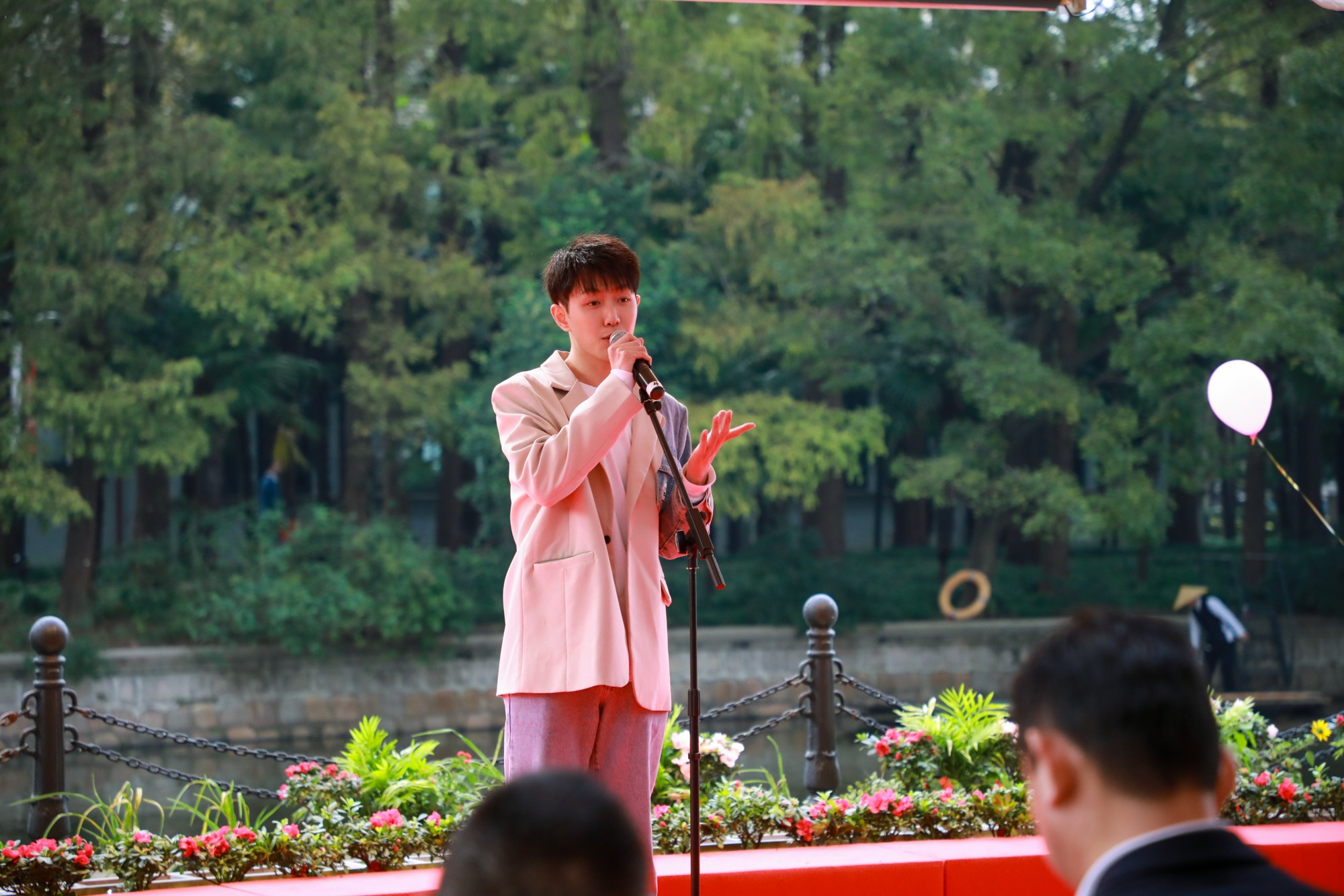 由音乐学院学子带来的二重唱《船歌》,选自歌剧《霍夫曼的故事》;传播学院学子带来的情景朗诵《欢庆,在聚梦之地》,均在丽娃河上泛舟吟唱,随着轻舟缓行,悠扬的诗乐声由远及近,再自波光粼粼的河岸旁荡漾开去,缭绕在秋日的晴空。歌曲《舞动人生》由音乐学院学子独唱。