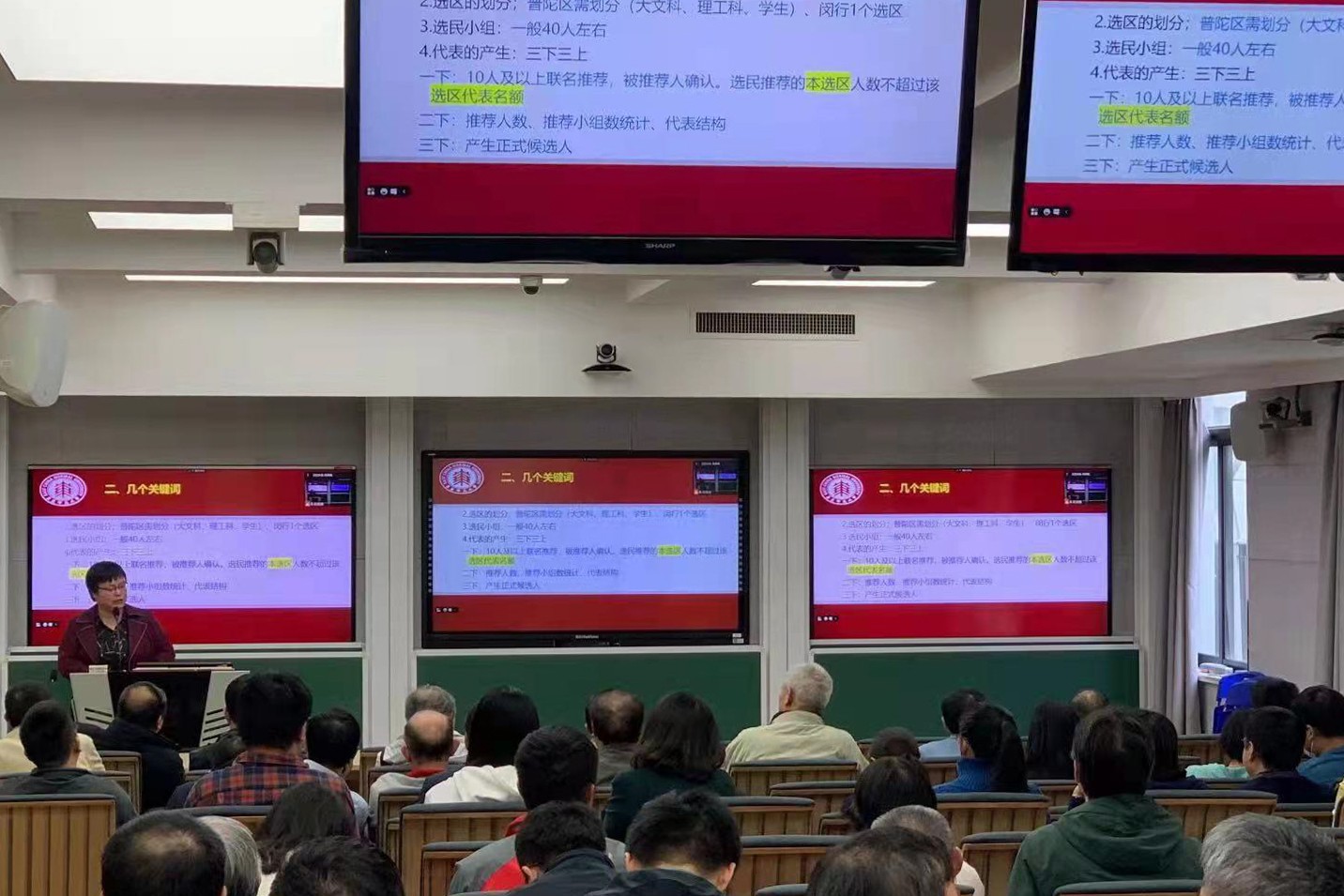 “人民代表大会制度是我国的根本政治制度”“坚持党的领导,充分发扬民主,严格依法办事”“人大代表人民选,人民城市人民建”“发展全过程人民民主,助力上海城市软实力提升”“积极参加换届选举,依法行使民主权力”的海报、标语张贴在学校食堂等人员聚集区域或者滚动呈现在每栋办公楼、教学楼入口的大屏幕上,营造了热烈的选举氛围。各学部、院系的党委书记、副书记、学生工作辅导员以及机关各部处积极行动起来,认真贯彻校党委书记梅兵同志在动员大会上的讲话精神和工作要求,迅速召集本单位的教职工和学生进行传达、宣传,以进一步增强选举工作的责任感和使命感,深刻领会中央精神,贯彻市委和学校党委要求,使换届选举工作的全过程成为加强党的领导、充分发扬民主、严格依法办事的全过程,成为全校师生广泛参与社会主义民主政治的实践。