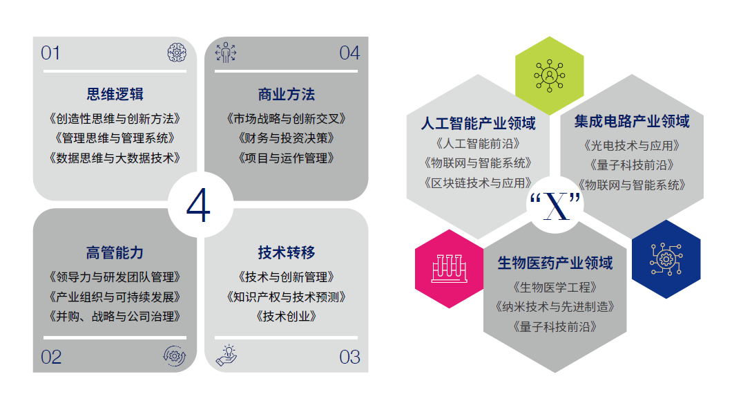 每位学员在修读周期中选择确定超限制造或人工智能和信息技术等新工科领域,以人工智能、集成电路、生物医药三大产业和若干战略性新兴产业选修相应的技术前沿课程,实现产业特色培养目标。