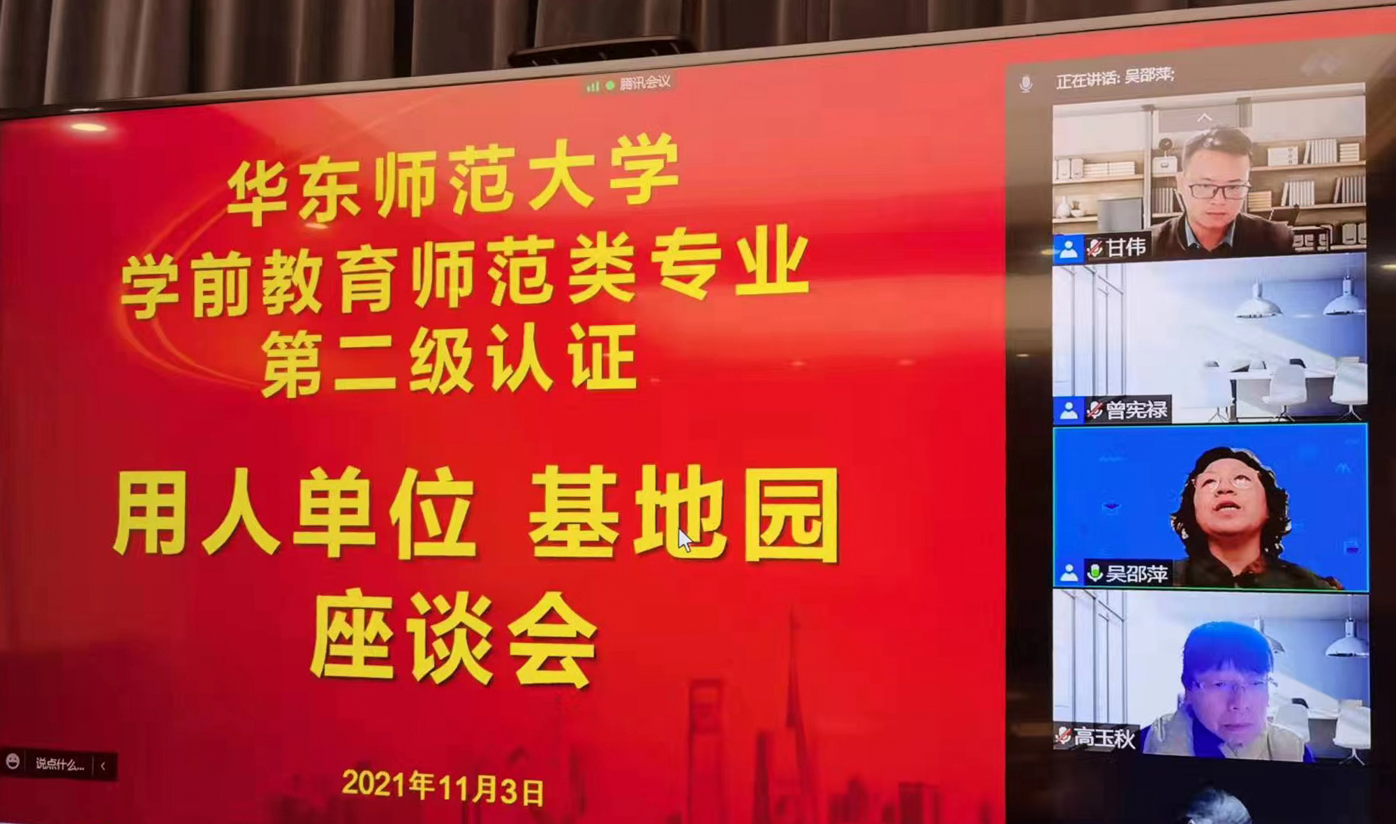 11月2日上午,认证专家组见面会通过线上线下相结合的方式举行。认证专家组全体成员线上参会,华东师大副校长戴立益,党委学生(研究生)工作部、教务处、招生办公室等相关职能部门负责人,教育学部党委书记房建军、党委常务副书记黄瑾、教育学部常务副主任荀渊等学部党政班子成员,学前教育学系教工党支部书记左志宏、副系主任苏雪云以及全体教师线下出席本次见面会。
