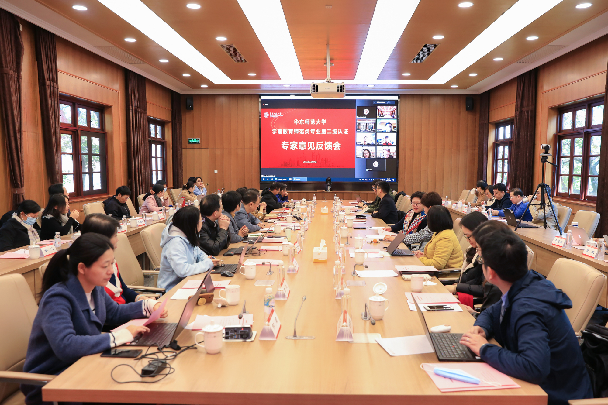11月9日上午,专家组考察意见反馈会通过线上线下相结合的方式举行。专家组全体成员线上参会,华东师大副校长戴立益,教务处、党委学生(研究生)工作部、招生办公室等相关职能部门负责人,教育学部党政班子成员,学前教育学系负责人以及全体教师在校内集中参会。
