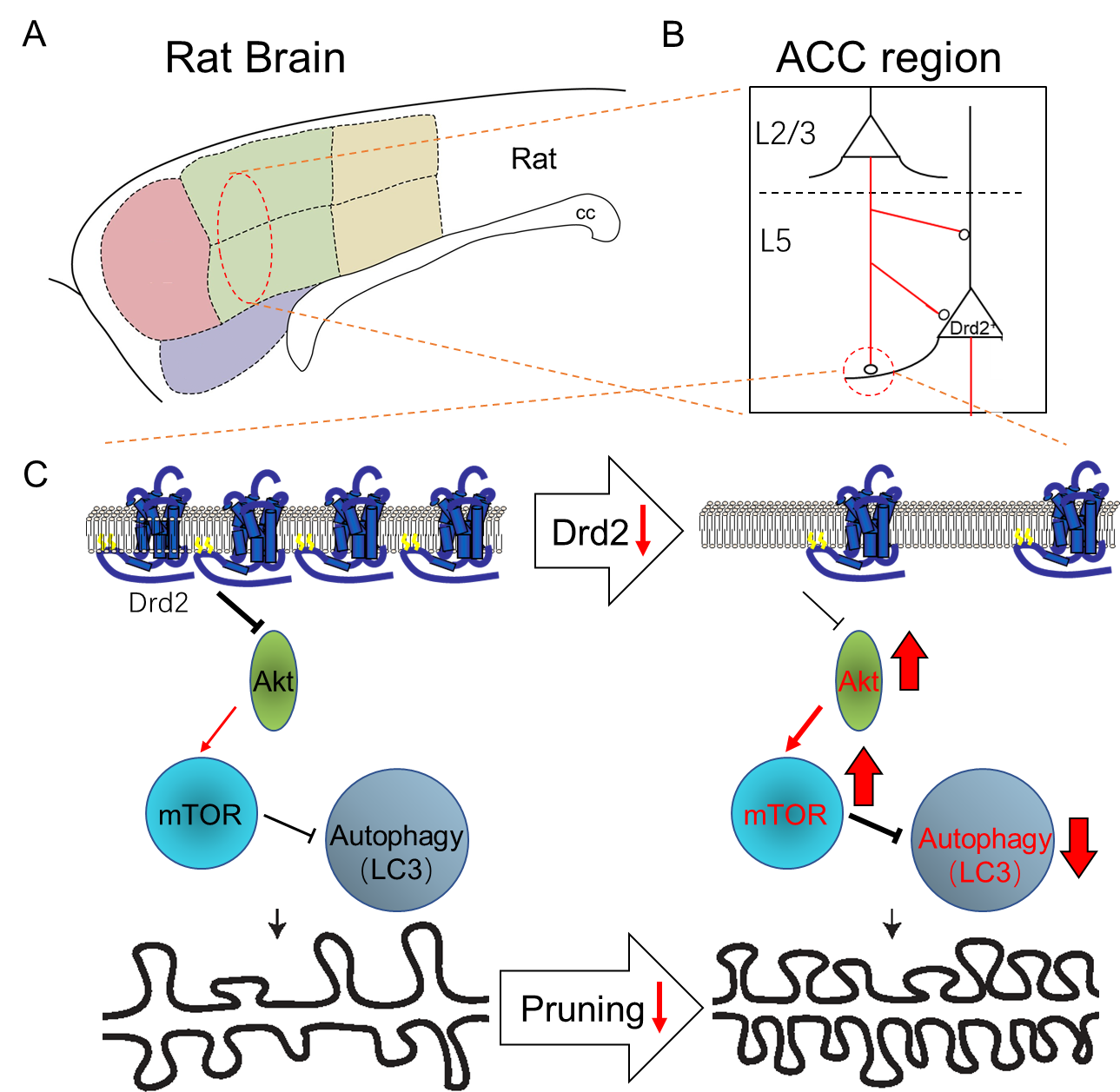 图3:Drd2调节大脑皮层突触修剪的细胞分子机制
