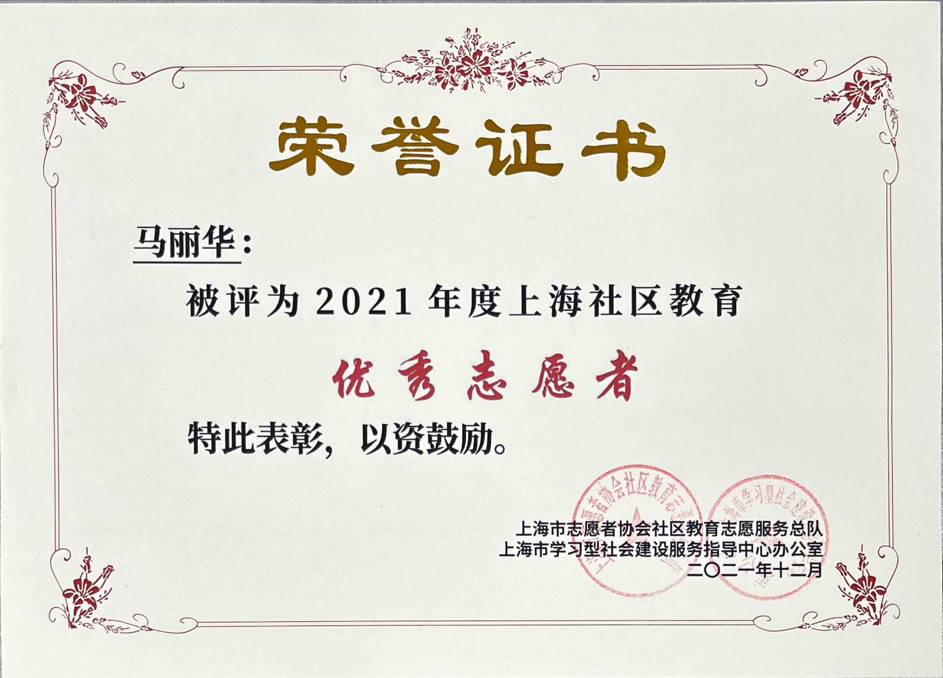 马丽华、邱俊莲老师获“2021年度上海社区教育优秀志愿者”称号