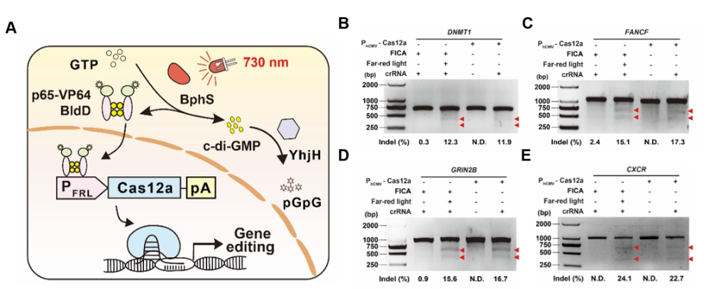研究人员首先设计了远红光调控的CRISPR-Cas12a基因编辑系统(简称FICA),其设计原理如下图所示,远红光作为基因开关可以精准调控Cas12a的表达,在crRNA的帮助下,现了对多种基因的高效切割。