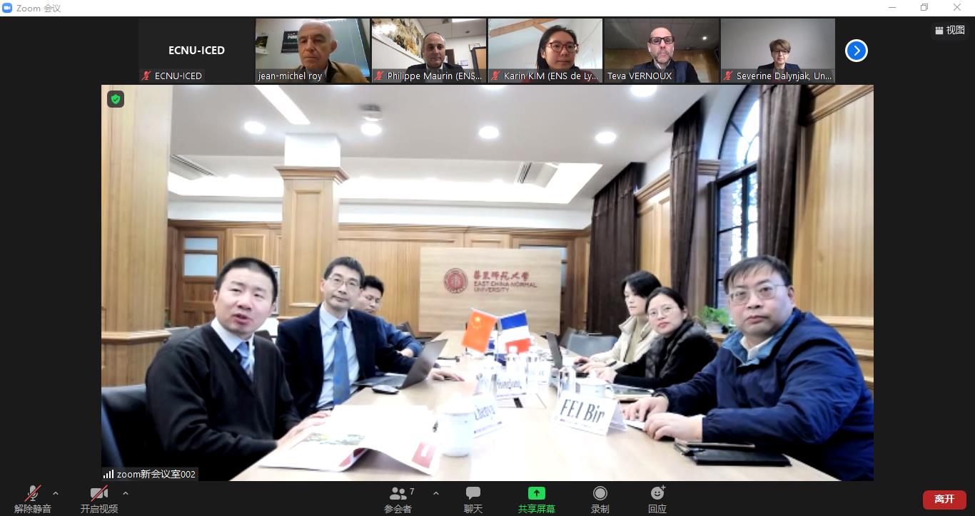 副校长顾红亮在致辞中感谢里昂高师长期以来对两校合作的重视和支持,他从自己十余年来作为JoRISS项目的参与者和管理者的经历出发,高度肯定了JoRISS项目运行以来对两校联合科研的重要推动作用,并希望两校能在全球新冠肺炎的不利影响下积极探索项目发展新模式。VERNOUX副校长指出国际化战略对里昂高师的发展具有重要意义,与华东师大合作举办的中法联合培养研究生项目(PRoSFER)和中法社会与科学联合研究院(JoRISS)是该校推进国际化发展的重要成果,未来里昂高师将更多聚焦在应用科学、数据科学等领域的国际合作,以期为社会发展提供更多的解决方案。里昂大学国际办公室负责人Severine DALYNJAK还介绍了该校最新情况,表示里昂大学高度重视与华东师大为代表的中国高校的友好关系,并积极探索新的合作项目。