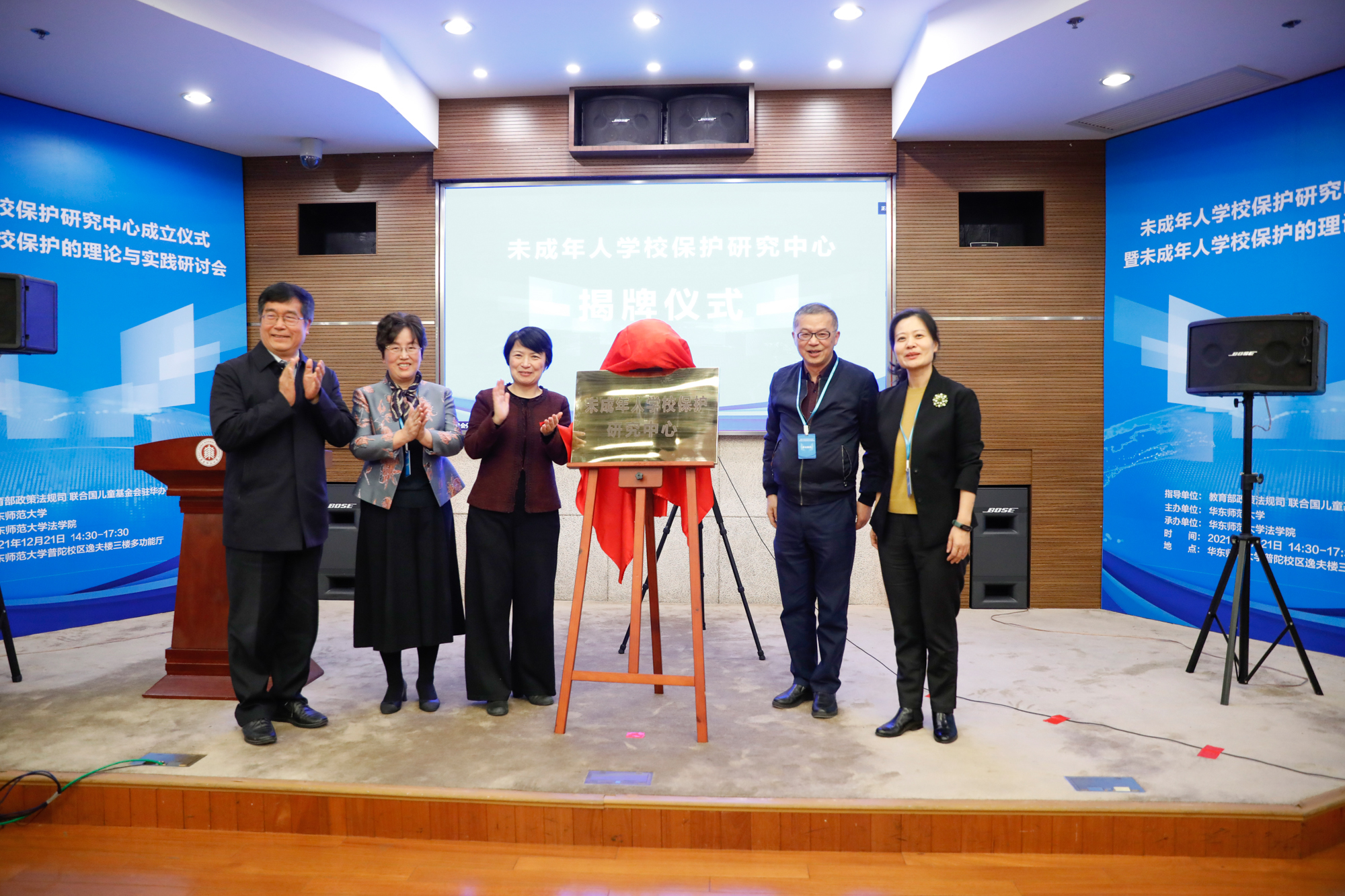 华东师大党委书记梅兵、上海市教育委员会总督学平辉、联合国儿童基金会高级教育官员王海燕、华东师大校长助理兼未成年人学校保护研究中心主任吴瑞君、华东师大法学院院长张志铭共同为中心揭牌