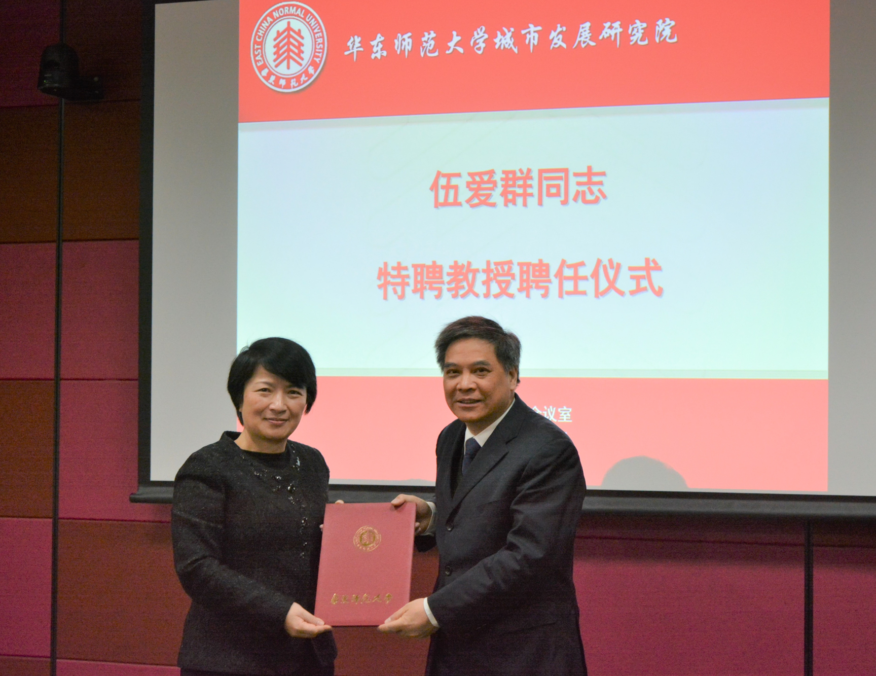 2021年12月30日上午,上海市政协委员、上海市政协经济委员会副主任、上海航天信息科技研究院院长伍爱群受聘beat365正版唯一官网特聘教授仪式在城市发展研究院举行。华东师大党委书记梅兵为伍爱群颁发聘书。华东师大人文与社会科学研究院副院长费斌,人事处副处长战新华,华东师大原党委副书记、城市发展研究院副理事长罗国振教授,城市发展研究院院长曾刚教授,城市发展研究院文新华教授、谷人旭教授等出席聘任仪式。聘任仪式由华东师大校长助理吴瑞君教授主持。