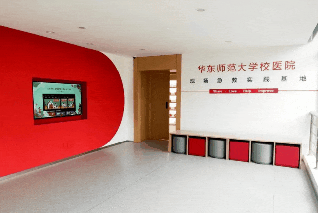 华东师大急救实践基地配备设施完备,位于闵行校区校医院四楼。该基地建筑面积470㎡,启用后组织急救培训近3000人。校医院培训团队联合市、区红十字会组织大学生军训急救培训,总计培训5000余人。