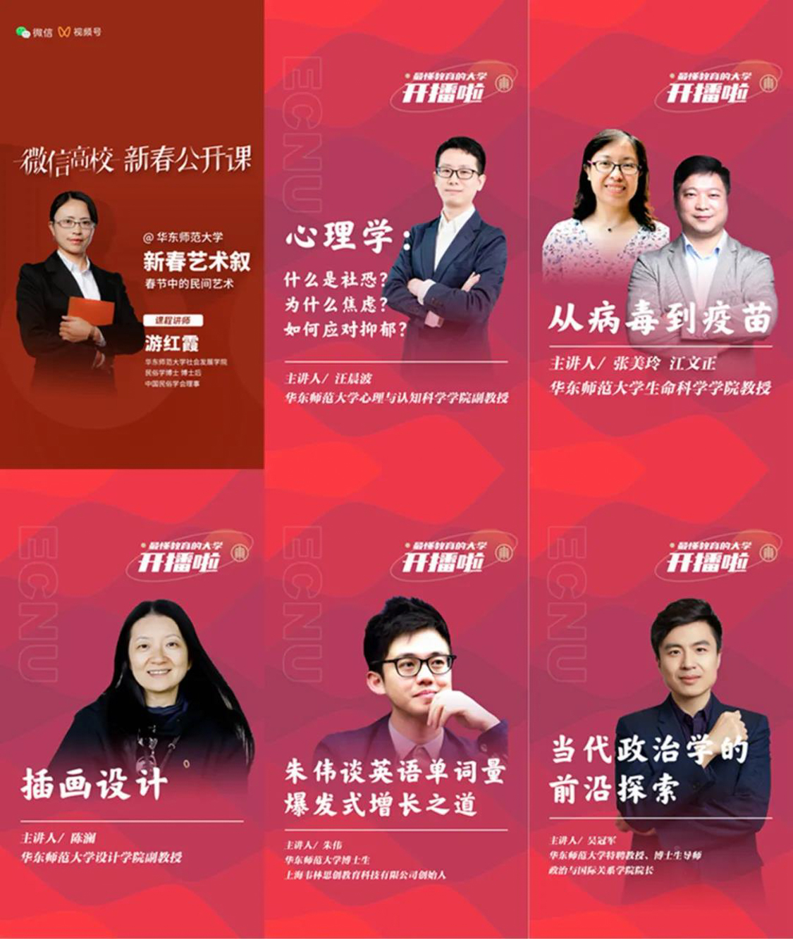 作为最懂教育的大学,华东师大特别推出了知识直播普惠计划-新春篇,以“最懂教育的大学开播啦”为主打理念,联合高校教授和学生up主齐聚授课,从腊月起至二月初每周四,以八场直播与大家“云上”相约共襄知识盛宴。