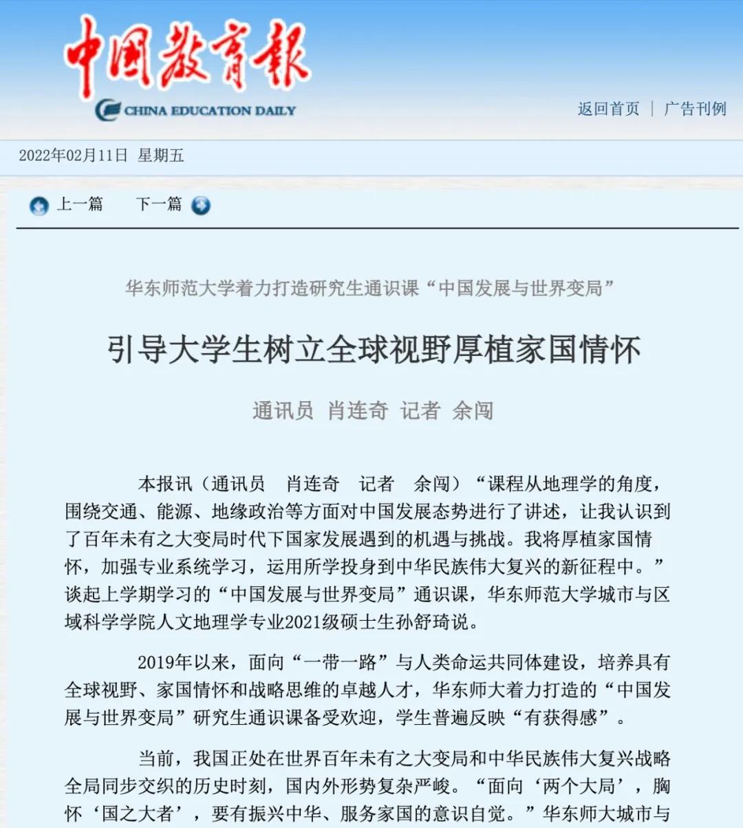 《中国教育报》2月11日第三版报道华东师大研究生通识课“中国发展与世界变局”
