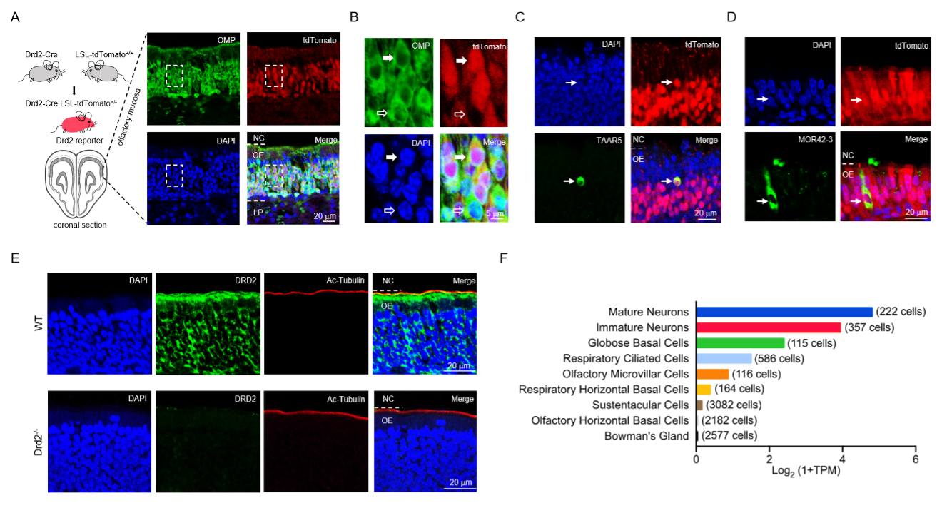 (A-B)Drd2荧光基因报告显示Drd2在大部分成熟嗅觉神经元中表达。B是A图中画框部分的局部放大。(C)Drd2与嗅觉受体TAAR5表达在同一个嗅觉神经元中。(D)Drd2与嗅觉受体MOR42-3表达在同一个嗅觉神经元中。(E)DRD2蛋白分布在小鼠嗅觉神经元的胞体和纤毛。下面是Drd2基因敲除小鼠的阴性对照。(F)人嗅粘膜主要细胞类型的Drd2表达水平。