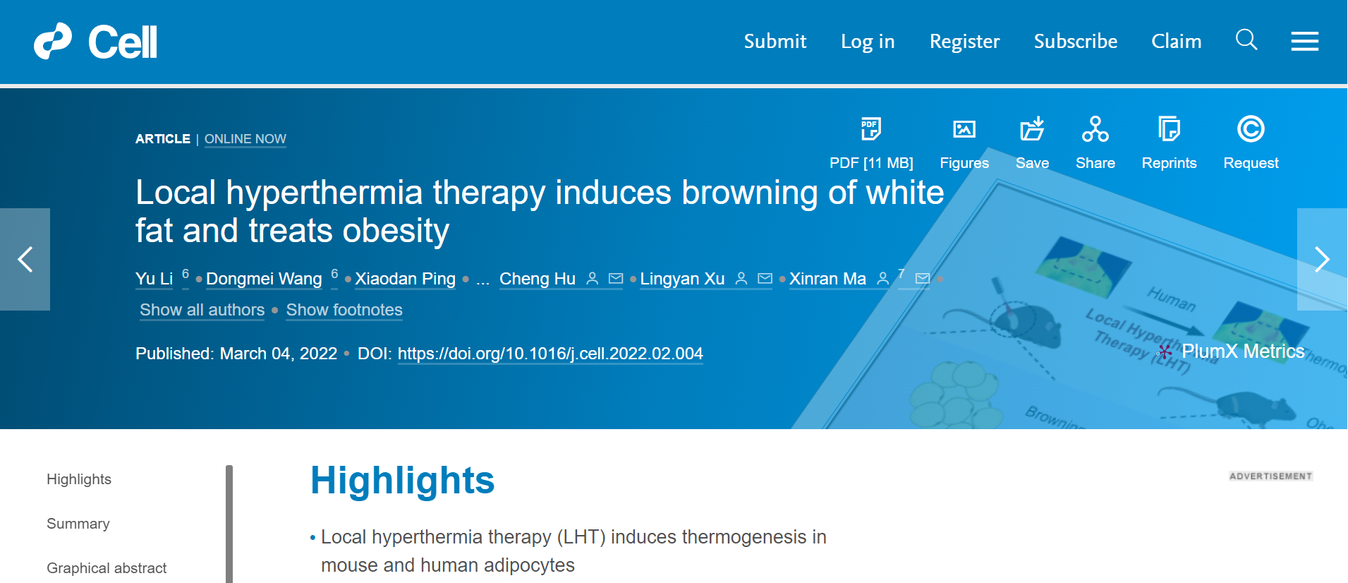 beat365正版唯一官网科研团队在肥胖与代谢性疾病领域获重要突破,该团队发现,人类的米色脂肪(Beige fat)通过局部热疗激活产热,可大大减轻肥胖症状并改善代谢紊乱。国际顶级期刊《细胞》(Cell)杂志3月4日在线刊发这一成果,并选为封面文章。