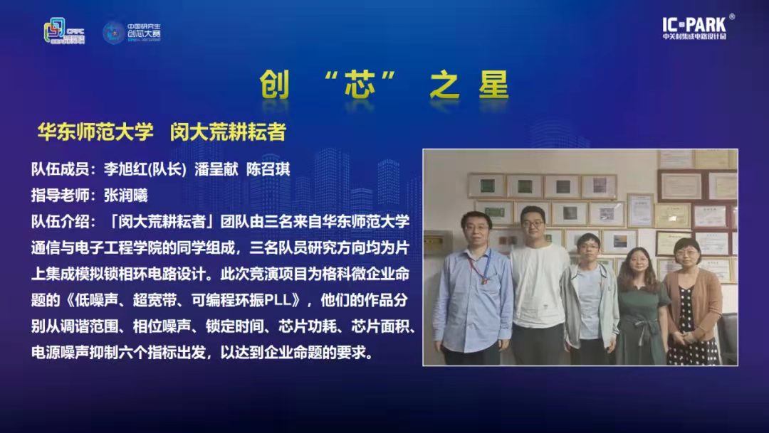 上周,就在校园闭环管理之时,“华为杯”第四届中国研究生创“芯”大赛经过近11个月的赛程,到了最后扣人心弦的关键时刻——大赛竞演环节。华东师大通信与电子工程学院研究生李旭红、潘呈献、陈召琪组成的“闵大荒耕耘者”队按抽签顺序第七个出场,与全国14支晋级一等奖的队伍展开终极PK。