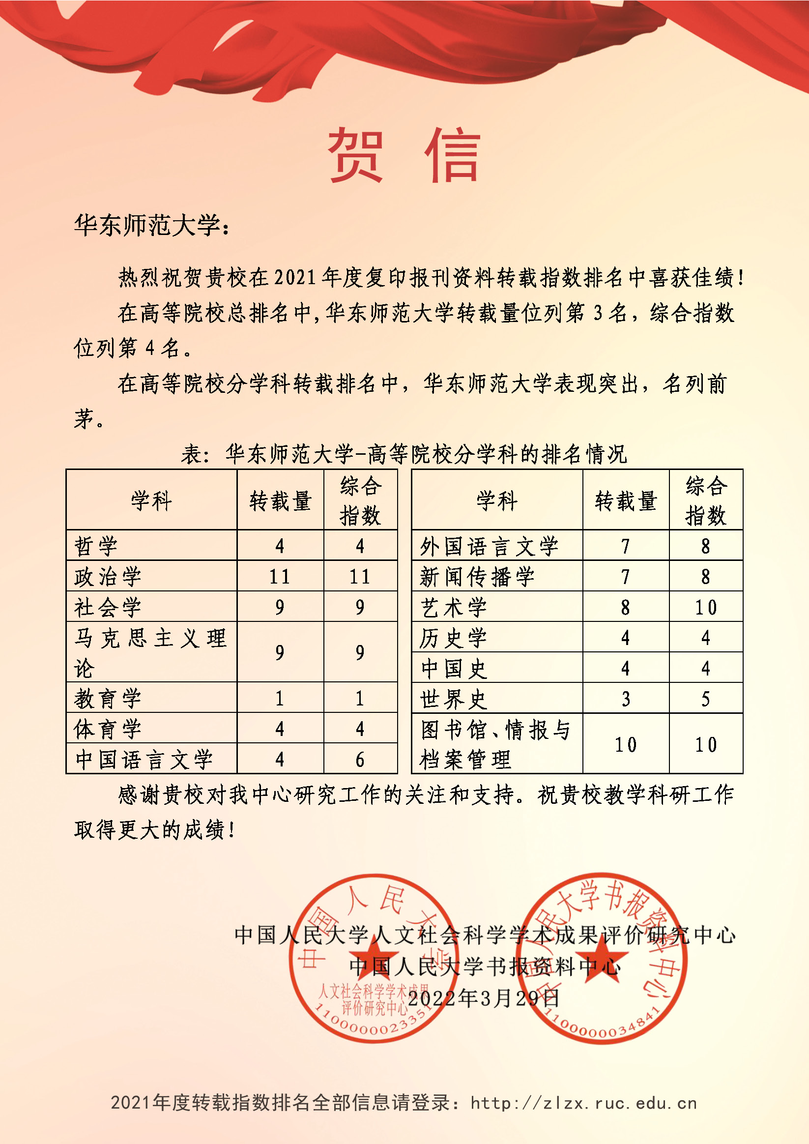 3月29日,中国人民大学人文社会科学学术成果评价研究中心和中国人民大学书报资料中心联合研制的2021年度复印报刊资料转载指数排名正式发布。从整体上看,华东师大各项数据表现出色。在高等院校总排名中,华东师大综合指数位列第四名。