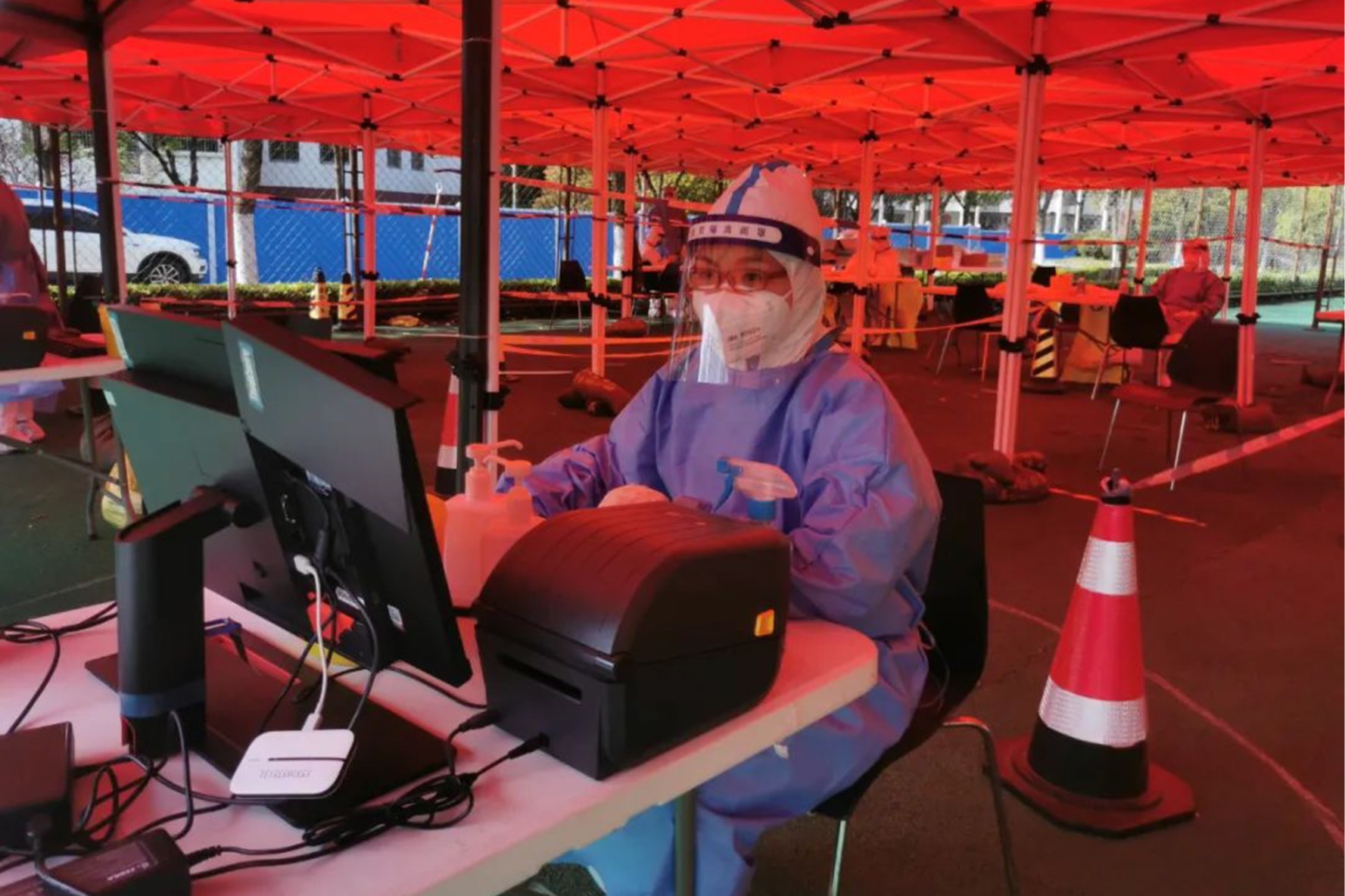 法学院辅导员王沁怡是区块二核酸检测进度与现场秩序维护的负责人,当天她却穿着一双夹脚凉拖站在本科生公寓片区核酸检测点的篮球场里。