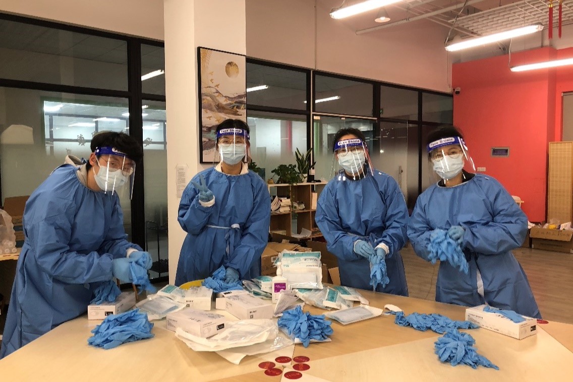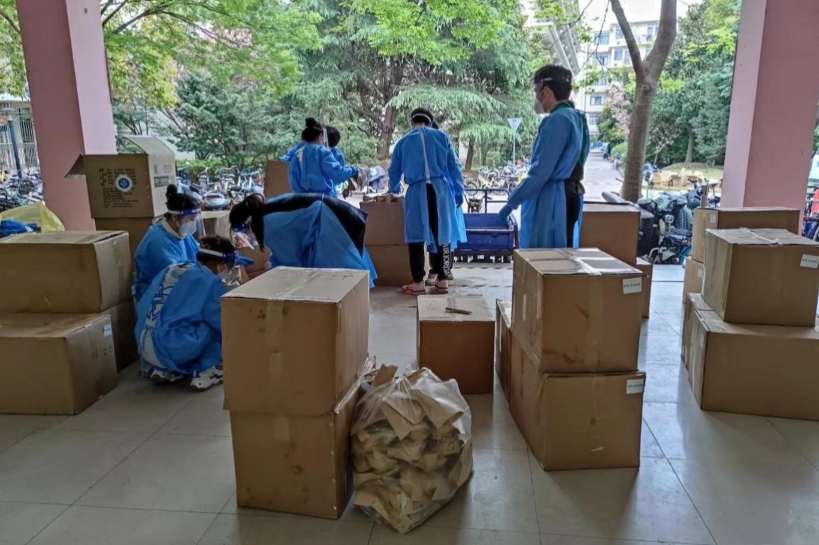 为楼内服务志愿者分发防疫物资(左起:吴潇宇、陈悦、纪晨毓、张铭荃)