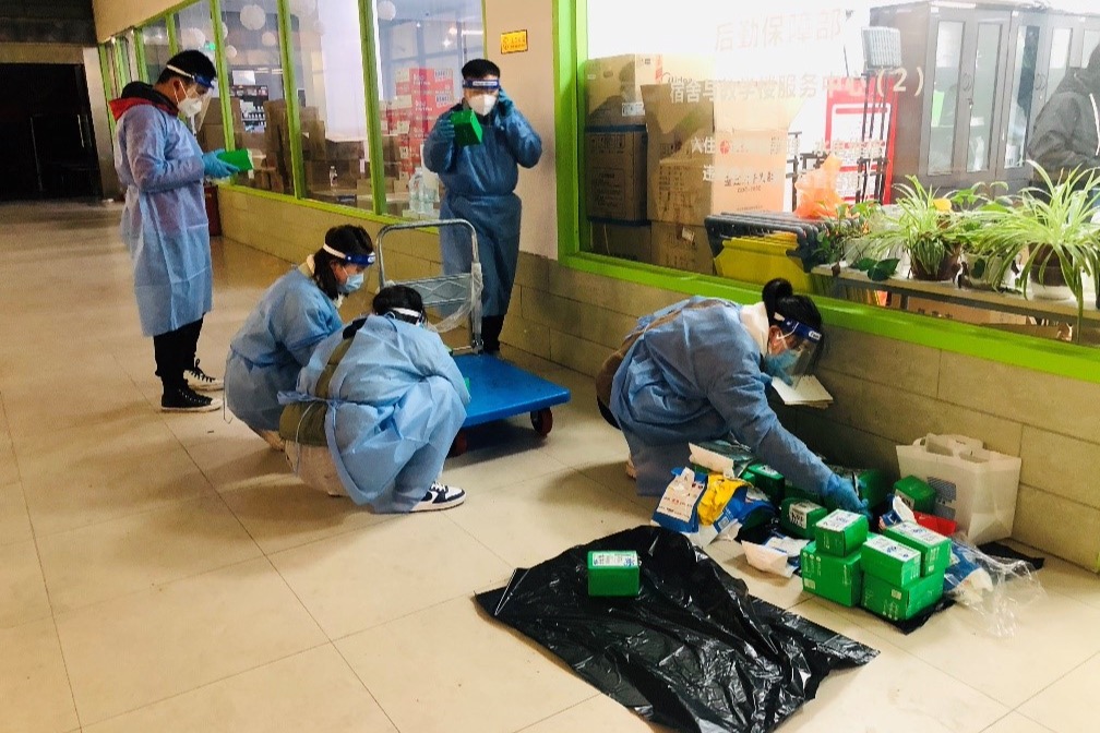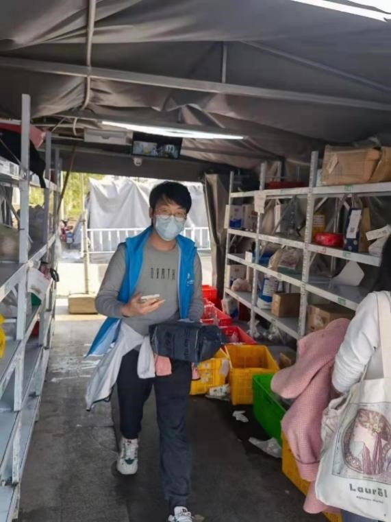 在王璐妍、韩亚鲁同学带领的党员志愿者团队负责维护核酸检测秩序这项志愿工作后,我便和孙帜、纪晨毓、陈悦三位同学一起负责起研究生公寓物资转运工作,协助工作组老师招募志愿者负责转递药品以及配送同学们在教育超市订购的生活物资。