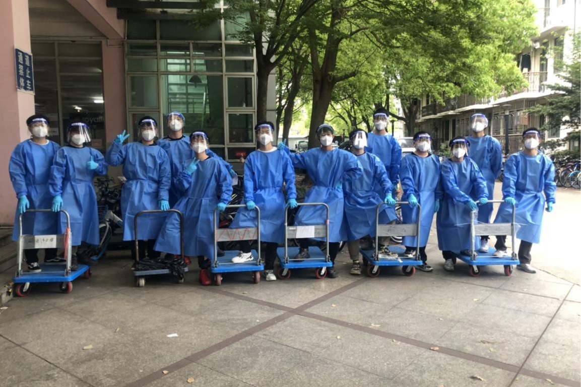 由于货品数量多,在最初还只有小推车可以运货,我们往往要运送多趟才能送完一栋楼的货物,需要10个志愿者花费2小时的时间才能完成研究生公寓区域所有物资的配送。