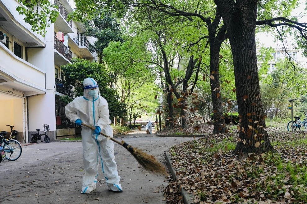 4月16日早上,我和黄岚兰、刘金玉老师重新出楼工作,面对园区内堆积如山的垃圾和落叶,我们紧急招募了一批志愿者换上“大白”。