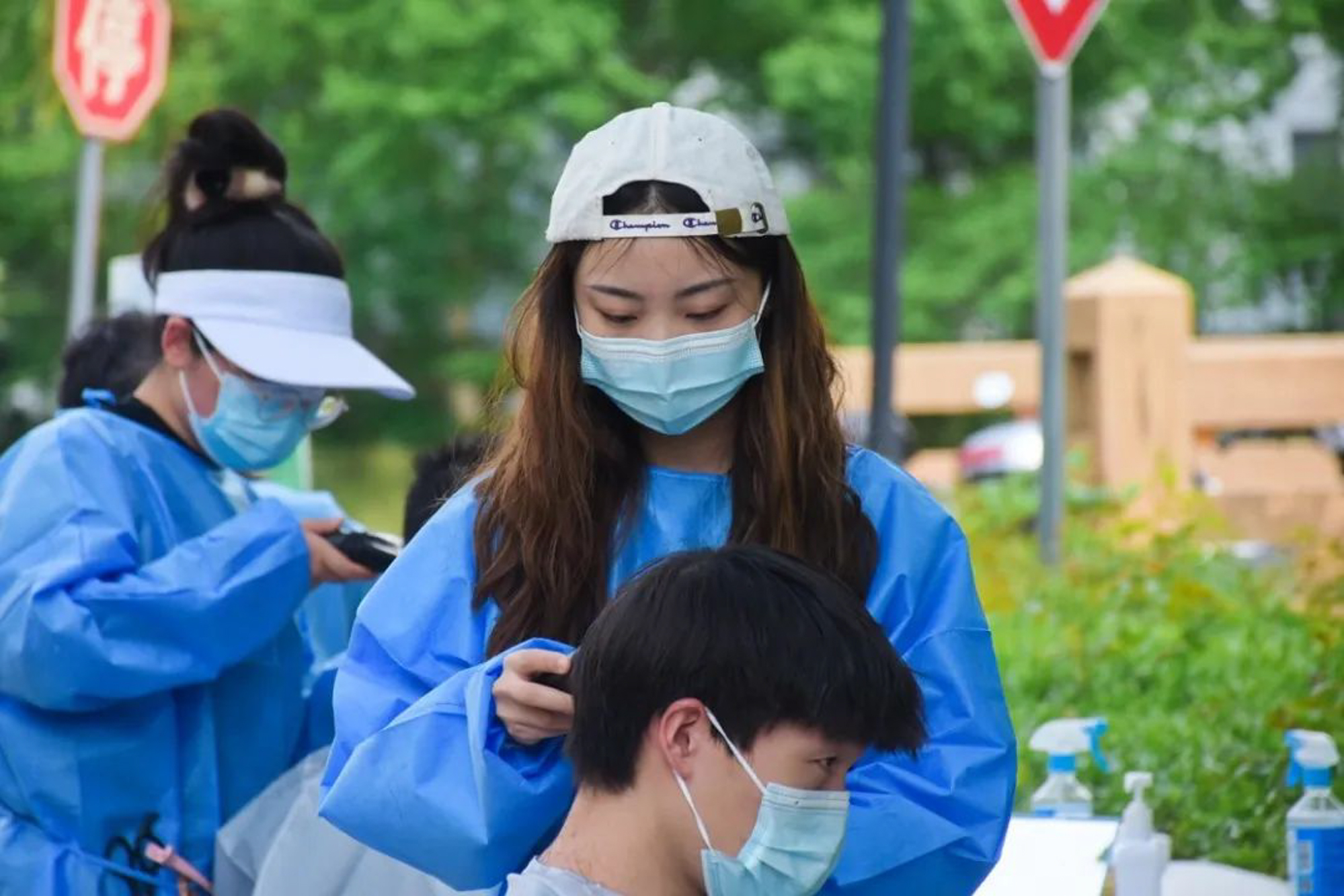 1把电动理发器、1个披风、2把梳子、1面镜子,再加上1桌和1椅,在五一劳动节这个特殊的日子,一群身着防护服、戴着口罩和手套的Tony就这样上岗了。