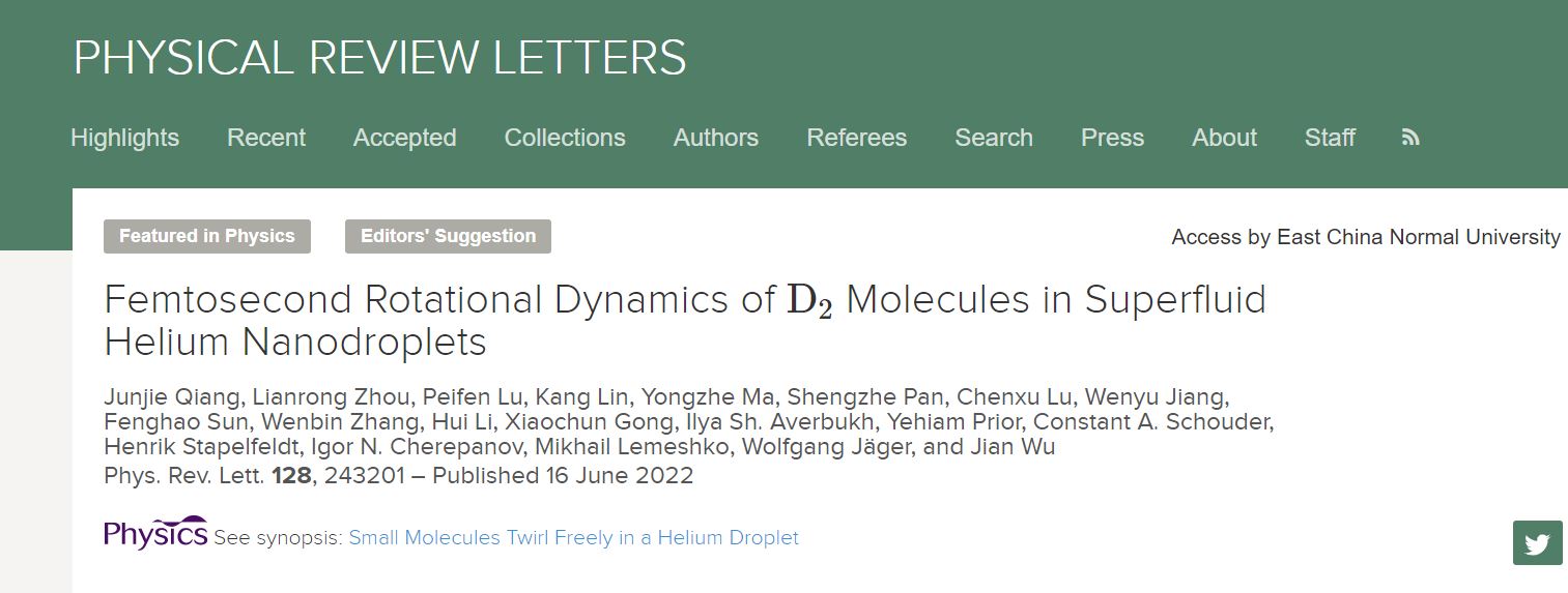 该工作6月17日以 "Femtosecond Rotational Dynamics of D2Molecules in Superfluid Helium Nanodroplets" 为题在物理学重要学术期刊Physical Review Letter上发表。相关研究工作受到科技部、国家自然科学基金委、上海市科委项目的大力支持。