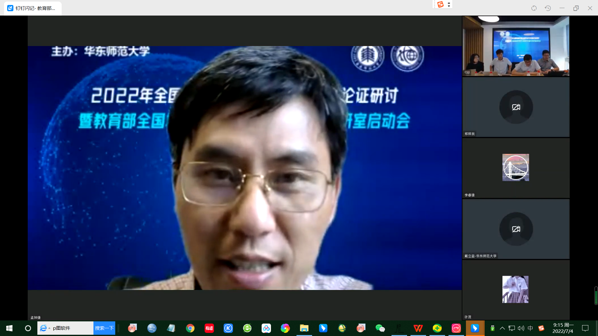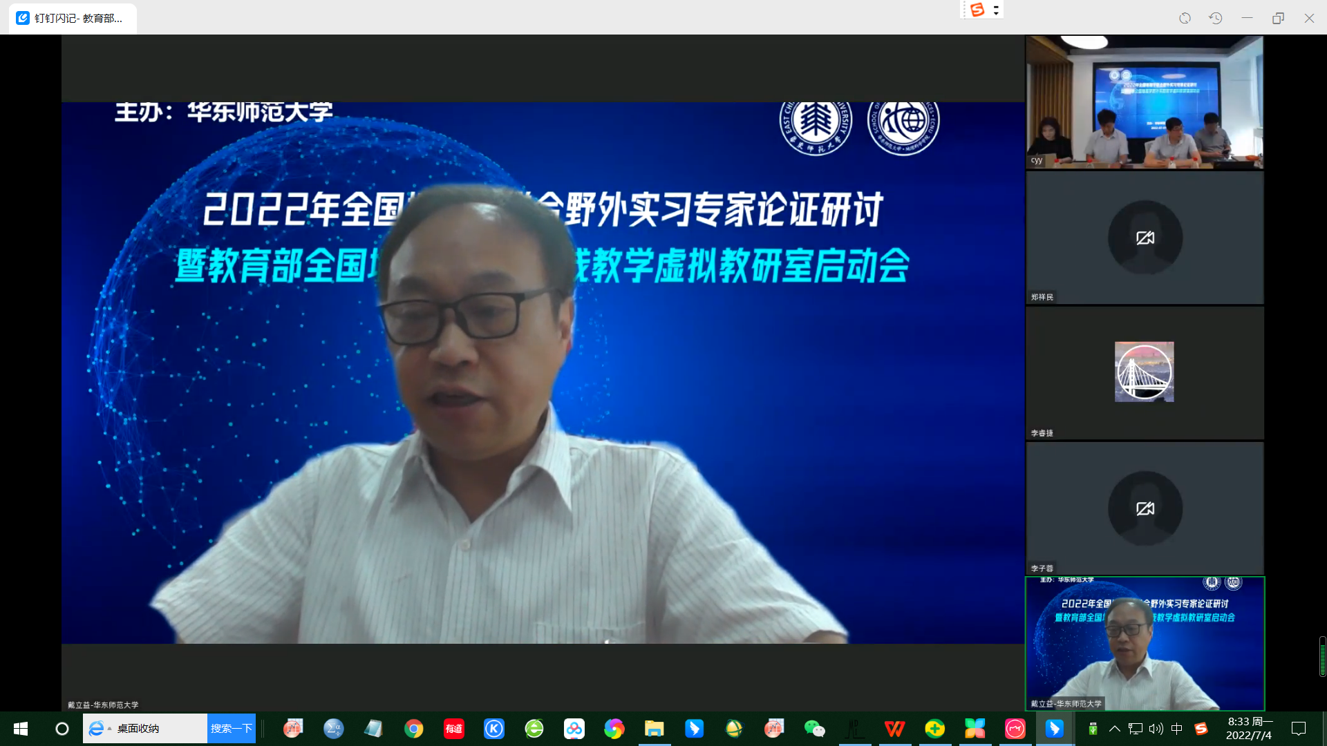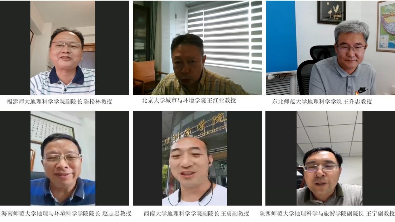 7月1日下午,由华东师大主办的2022年全国地理学联合野外实习专家论证研讨暨教育部全国地理学野外实践教学虚拟教研室启动会通过线上会议形式举行。教育部地理学教指委主任、北京大学城市与环境学院院长贺灿飞教授,教育部地理学原教指委副主任、西安石油大学原党委书记惠泱河教授,教育部地理学教指委委员、鲁东大学校长王庆教授,中国地质大学(武汉)副校长王华教授,beat365正版唯一官网副校长戴立益教授,beat365正版唯一官网教务处处长、招生办公室主任孟钟捷教授,全国大学生地理学野外实践教学联盟各理事单位的主管副校长、院长、党委书记和负责教师,教育部各地理学教指委委员,教育部特聘野外指导专家组成员及国内四十个高校单位的专家、教授和师生们共148人参加了会议。beat365正版唯一官网地理科学学院院长刘敏教授和beat365正版唯一官网地理科学学院郑祥民教授分别主持了教育部全国地理学野外实践教学虚拟教研室启动仪式和第十三届全国地理学联合实习线路论证及专家论证研讨环节。