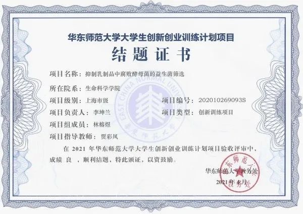 课堂之外,她积极参与各类研究课题,提升自己的实验技能和专业素养,曾分别以课题组长和成员身份完成两项上海市创新创业项目——《不同生长阶段白及种子菌根真菌多样性的研究》和《抑制乳制品中腐败菌的益生菌筛选》,参与“立德树人”人文社会科学重点研究基地建设项目,并带领成员完成相关校级创新创业项目。