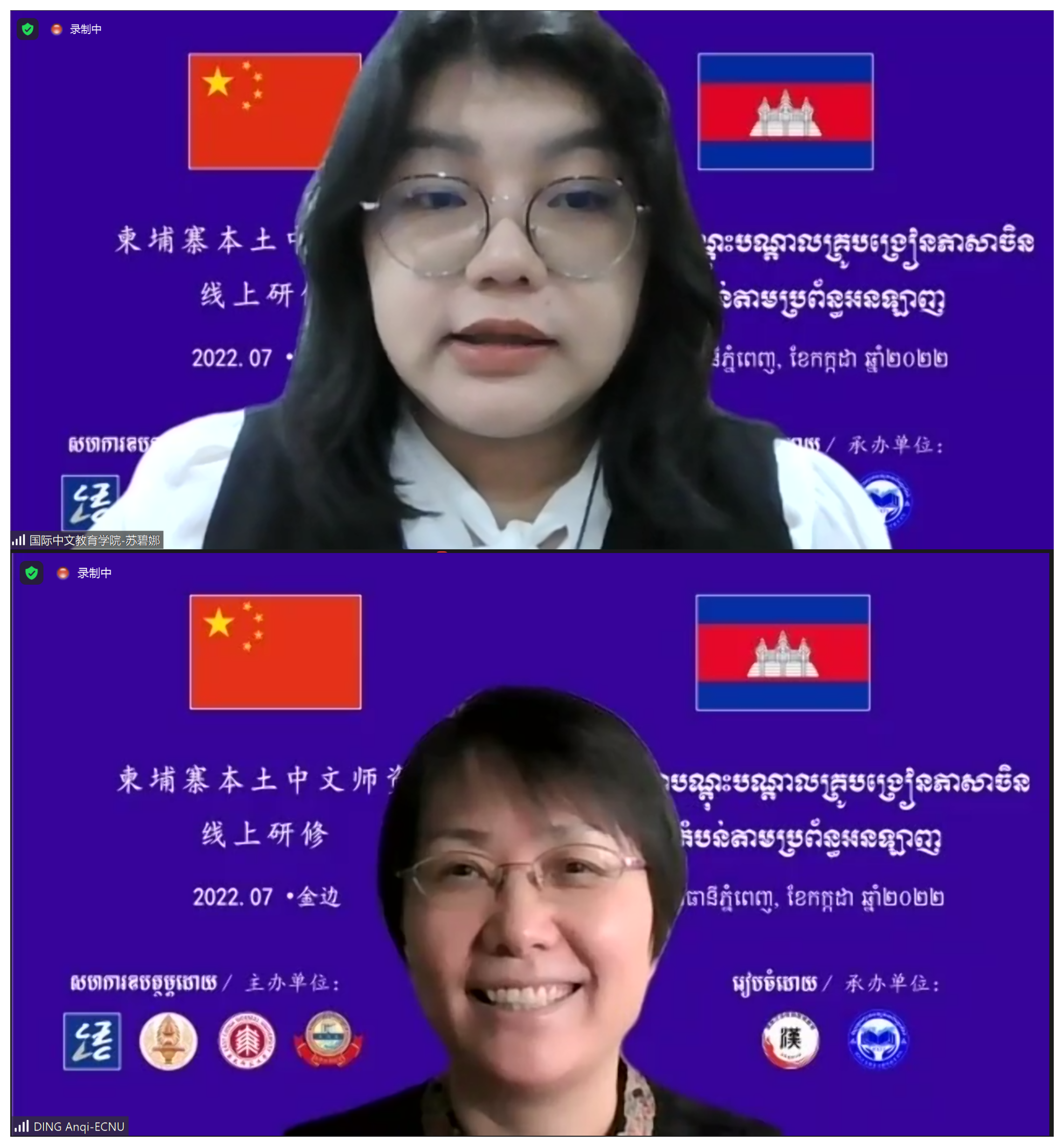 开班仪式由华东师大国际汉语文化学院副院长、国际汉语教师研修基地副主任丁安琪和柬埔寨皇家科学院国际中文教育学院院长苏碧娜主持。