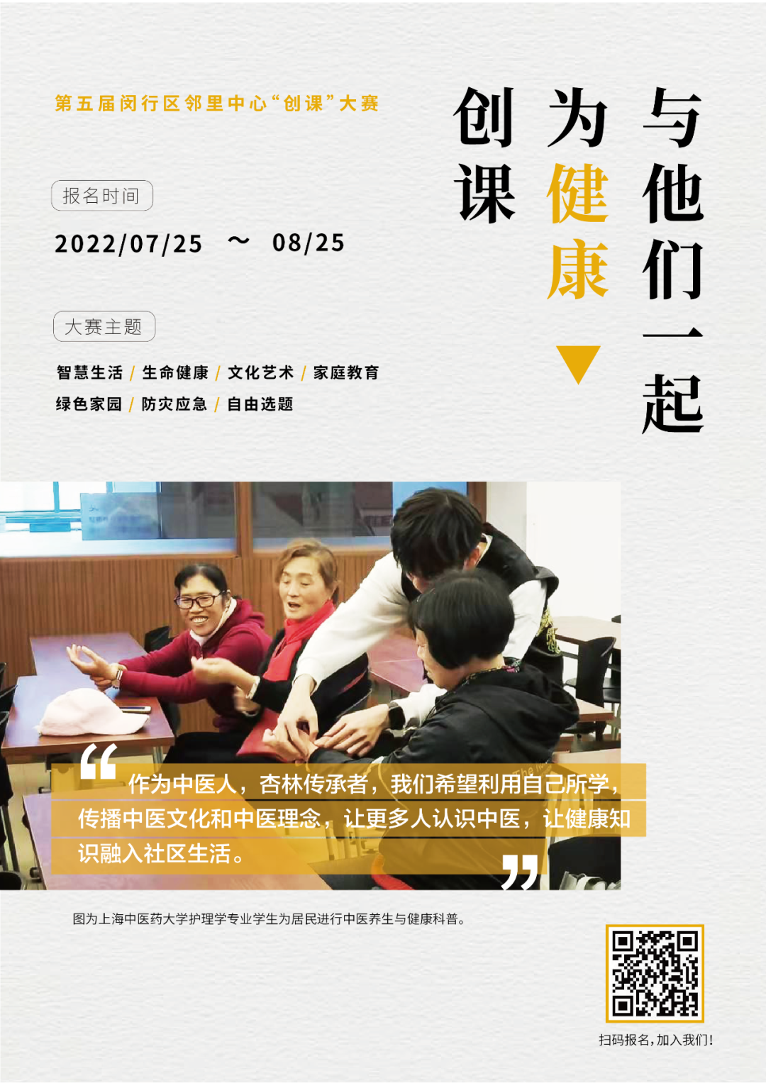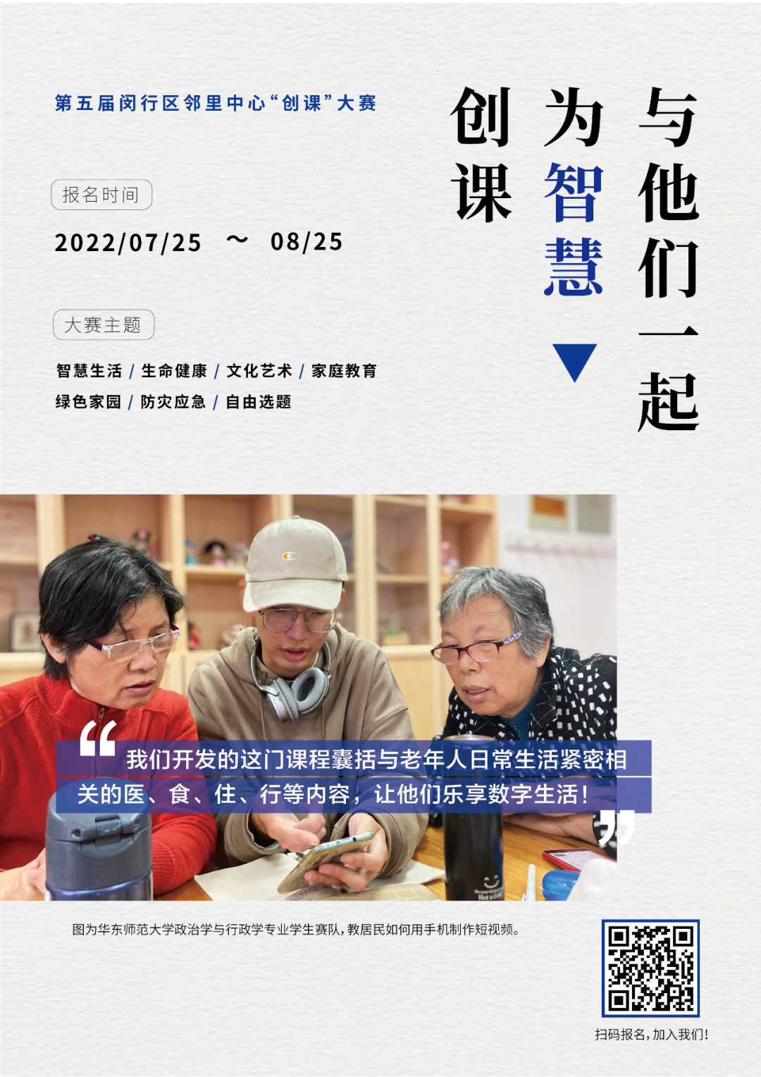 本届大赛继续秉承“问需于民”“能者为师”等服务理念,聚焦疫情防控中老年人的实际需求,结合第三届、第四届“创课”大赛的成果经验和当前新冠疫情防控常态化需要,倡导青年学生开发以线上微课为主、线下课程为辅的社区教育系列微课,尤其是助力老年人“智慧生活”的精品课程,满足闵行社会治理需要和社区居民多样化学习需求,提高老年人生活质量。