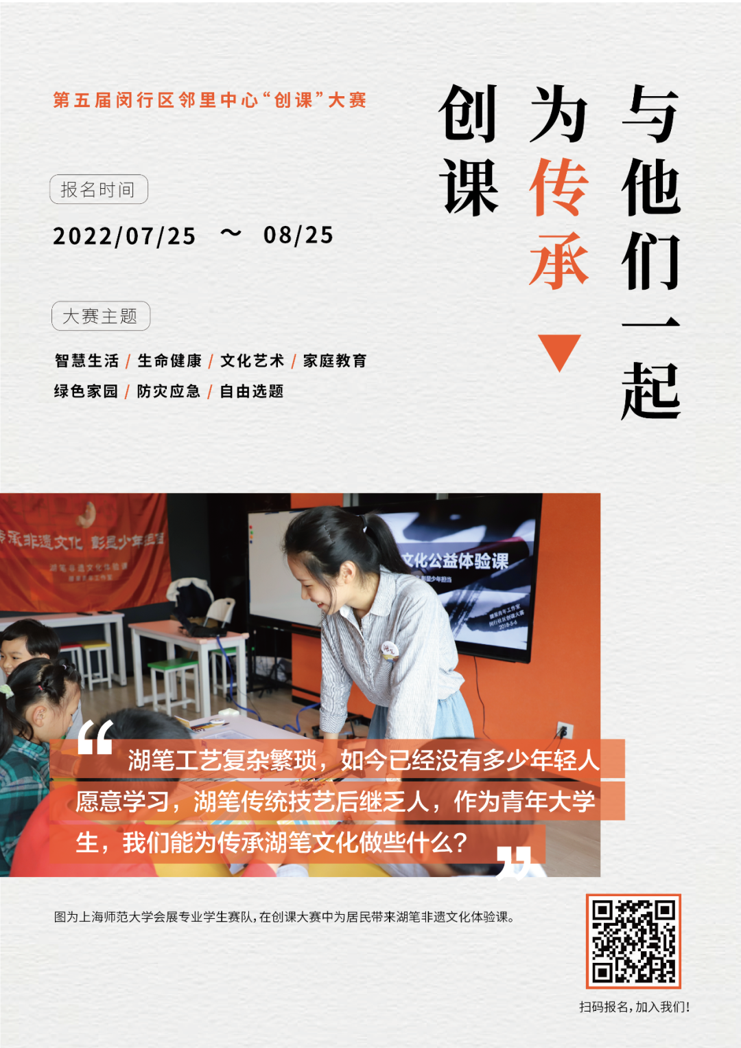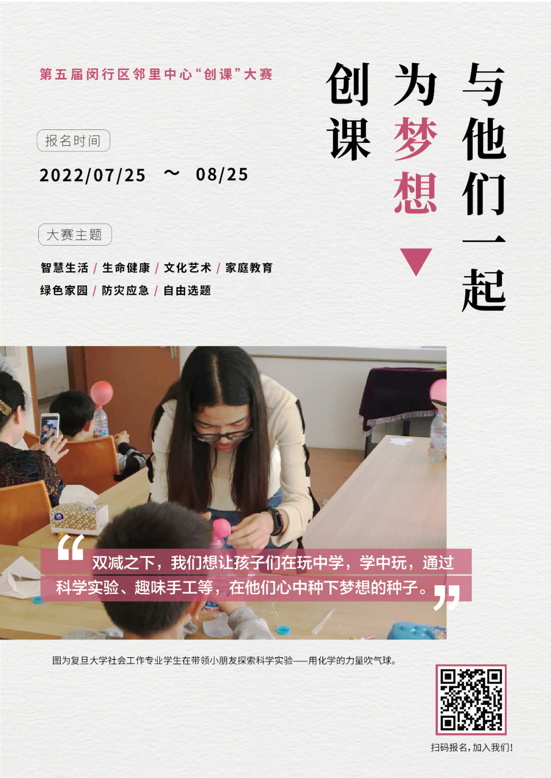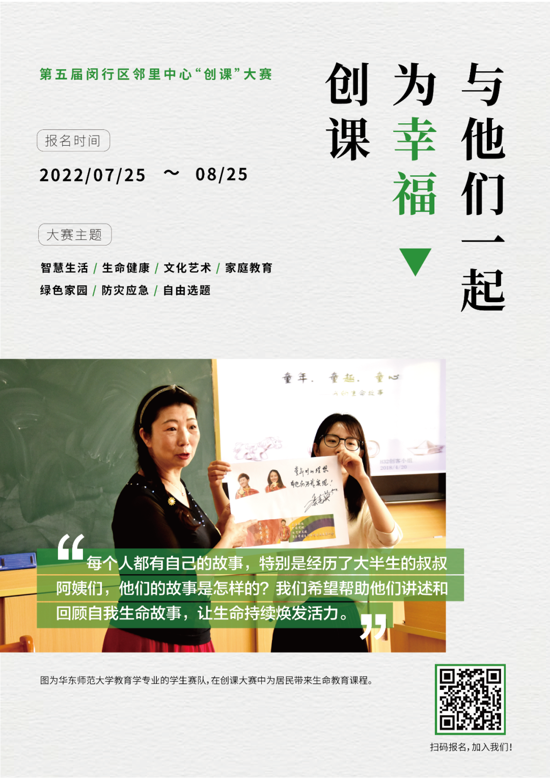 *参赛者可根据相关主题阐述,结合自身专业或兴趣选择其中一个主题报名参赛。以上阐述所涉及的课程范围较大,建议各参赛团队突破对社区课程的固有认知,洞察居民实际需求,以问题为导向,找寻更接地气的课程开发切入点。