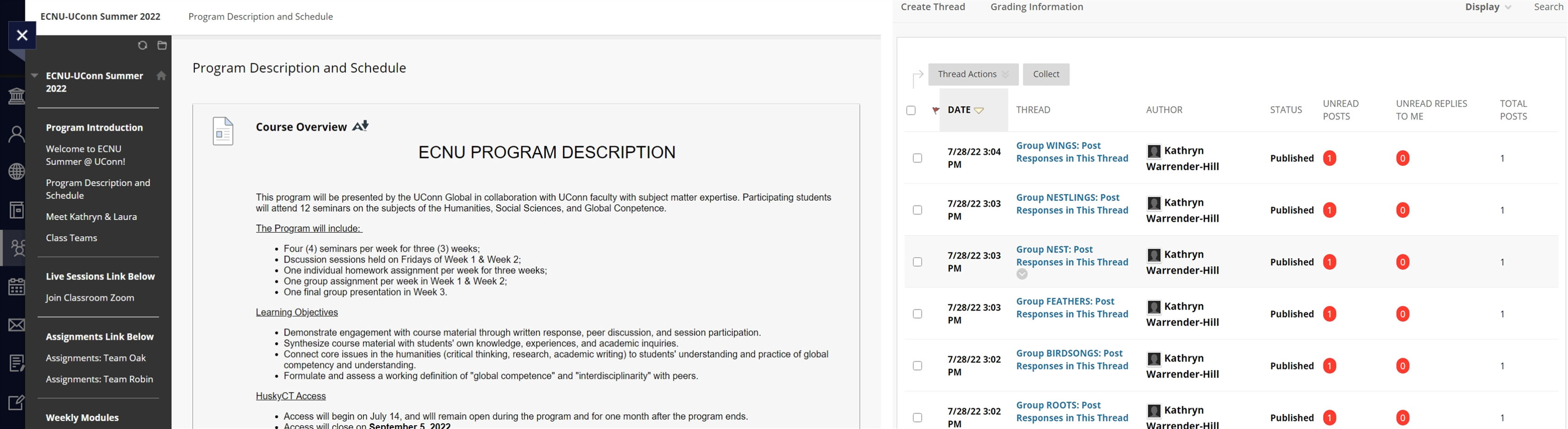 在教学辅助平台HuskyCT中,“每周模块”受到了同学们的欢迎。老师将预习资料和拓展文献上传平台,对同学回顾课堂内容、反思课程关联颇有帮助。小组成员能通过平台的讨论板看到其他组的想法并实时回应,助教也会提供思路。学习小组+教学辅助平台的深度融合,使教学质量和学习效率得到了更为充分的保障。